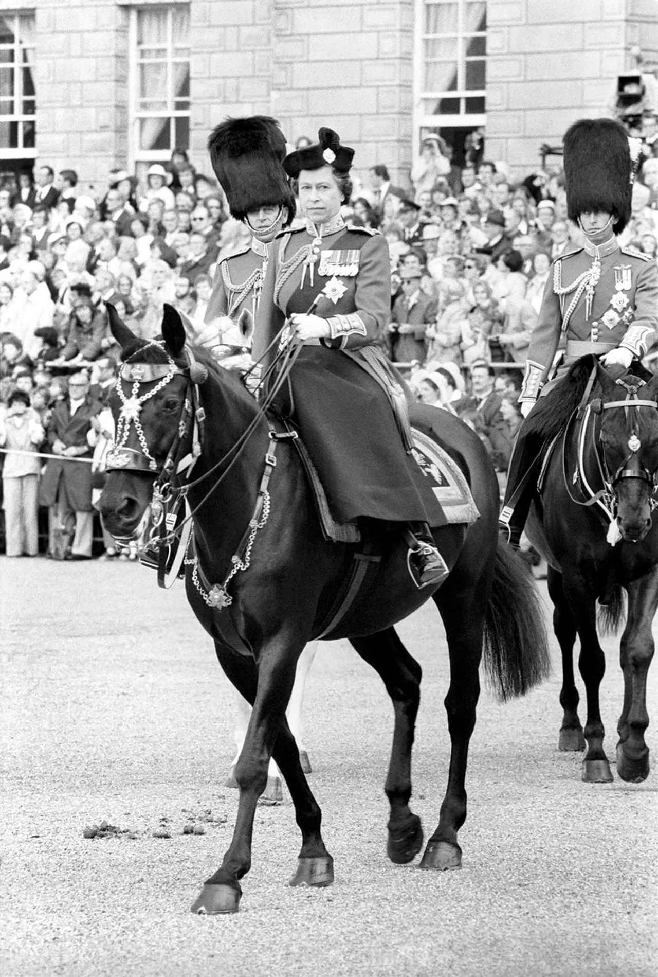 1977年の軍旗分列行進に馬に乗って登場した若き日のエリザベス女王。