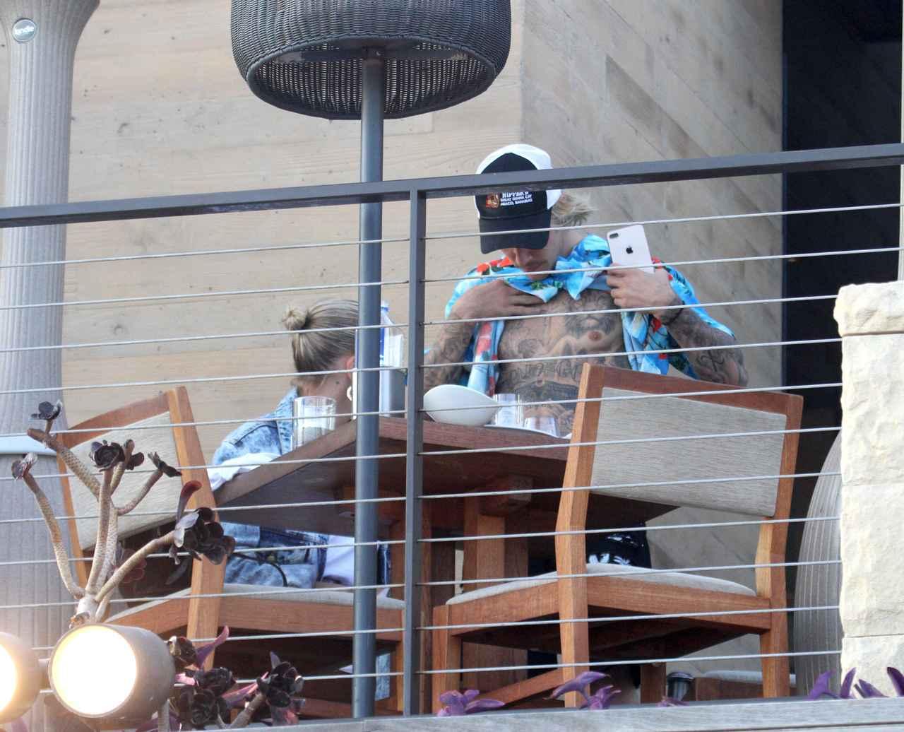 この日、ジャスティンとヘイリーが座っていたのは絶景が望めるオーシャンフロントのテラス席だったのだが、写真には景色そっちのけで怪しい行動を取る2人の姿が…。