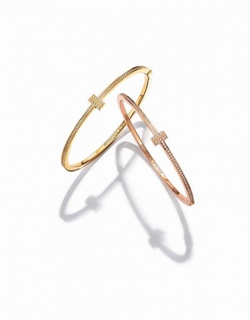 18Kイエローゴールド、ホワイトゴールド、ローズゴールドで展開するバングルは、大胆に組み合わせた2つのTのモチーフのアクセントにダイヤモンドの繊細な連なりが手首を飾るデザインとなっている。