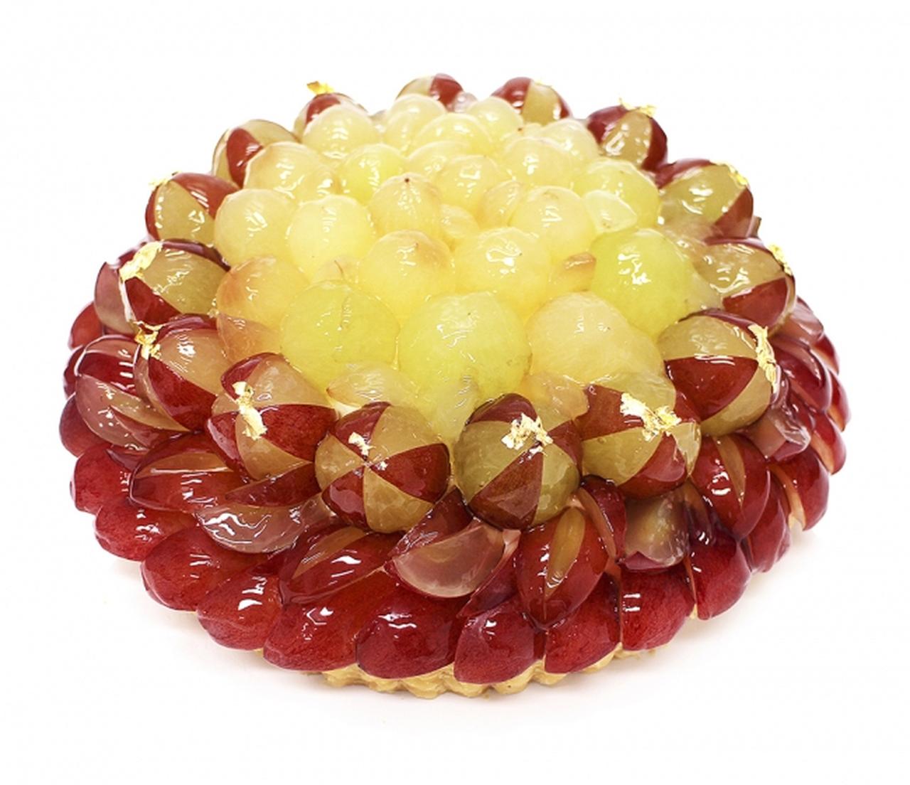 巨峰の2倍でゴルフボール程もある希少性の高いぶどう。大きい果肉に隠れた溢れんばかりの果汁が特徴。コクのあるマスカルポーネのベースに飾り付けた。