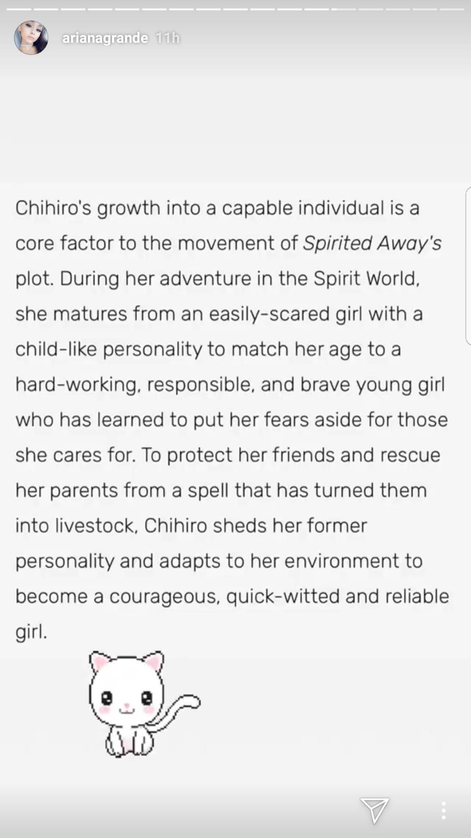 アリアナが公開したのは、千尋のパーソナリティーなどが書かれた文章。そこでは、映画の冒頭で臆病者だった千尋が大切な人のために勇敢な少女へと成長していく様子や、千尋が過去の自分から新しい自分へと生まれ変わる様子が説明されていて、千尋の勇敢さを強調する言葉が並んでいた。