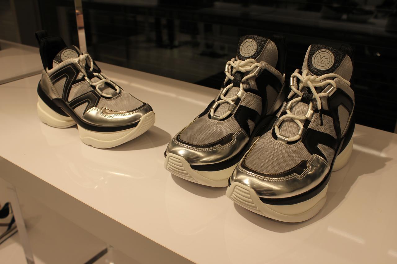 ピンク系のポップなカラーリングと、シルバーがアクセントになったブラック系のスニーカーはプラットフォームになった旬なデザイン。