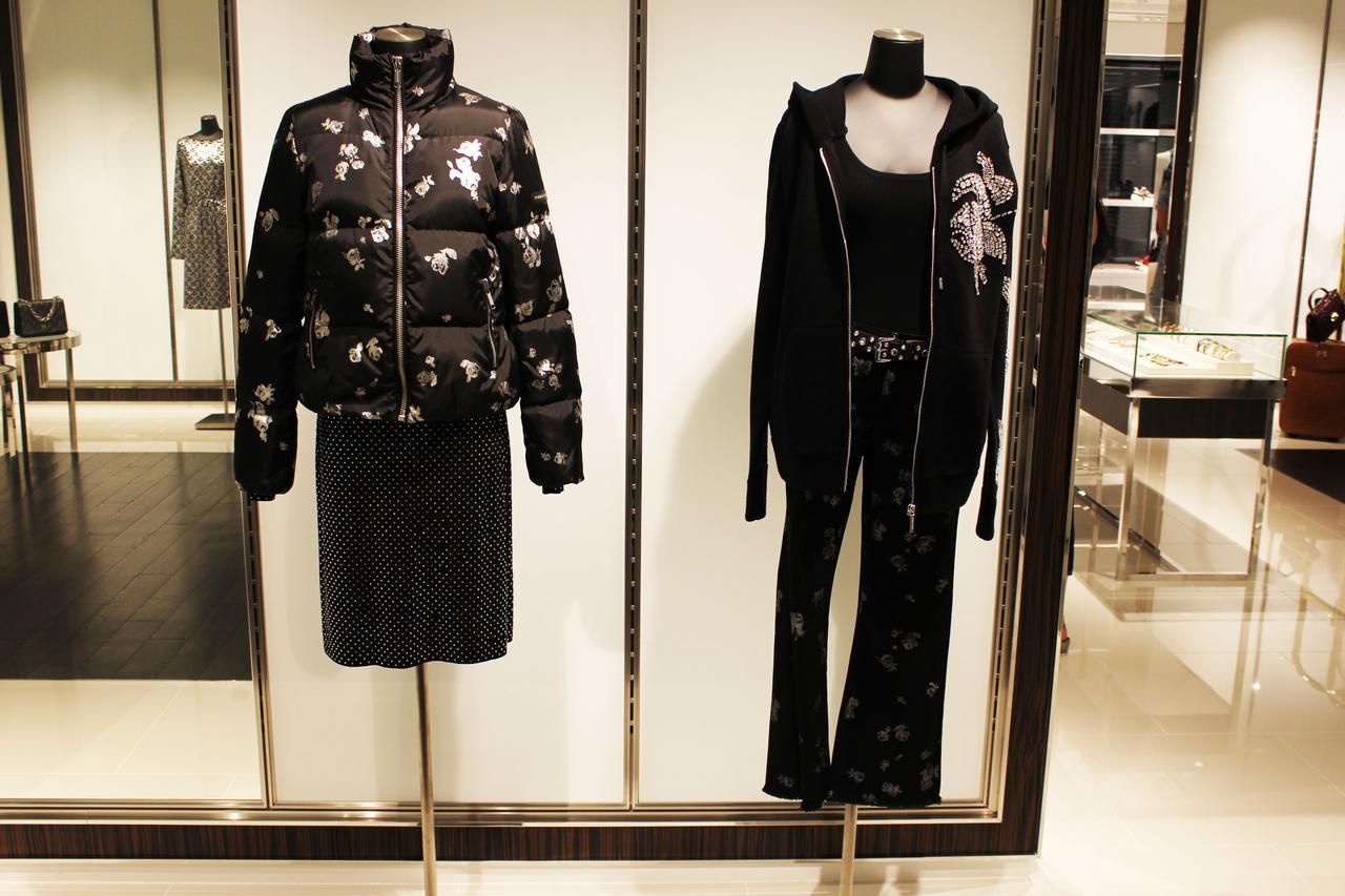 カジュアルスタイルに定番のダウンは、フラワープリントでフェミニンなスタイルに昇華され、スパンコールのラグジュアリーなドレスに合わせた都会的なコーディネートに。