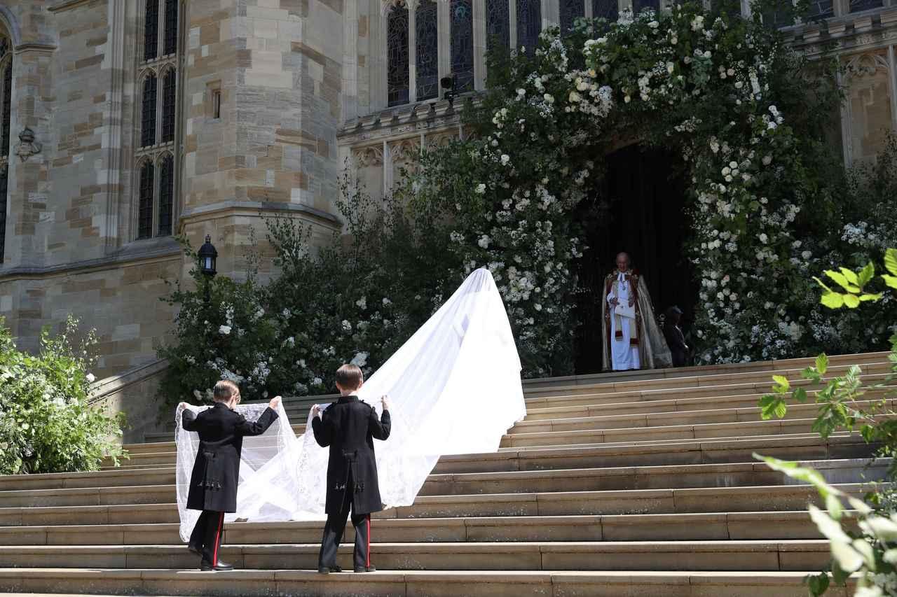 ジェシカの双子の息子がメーガン妃のベールを持つ姿。