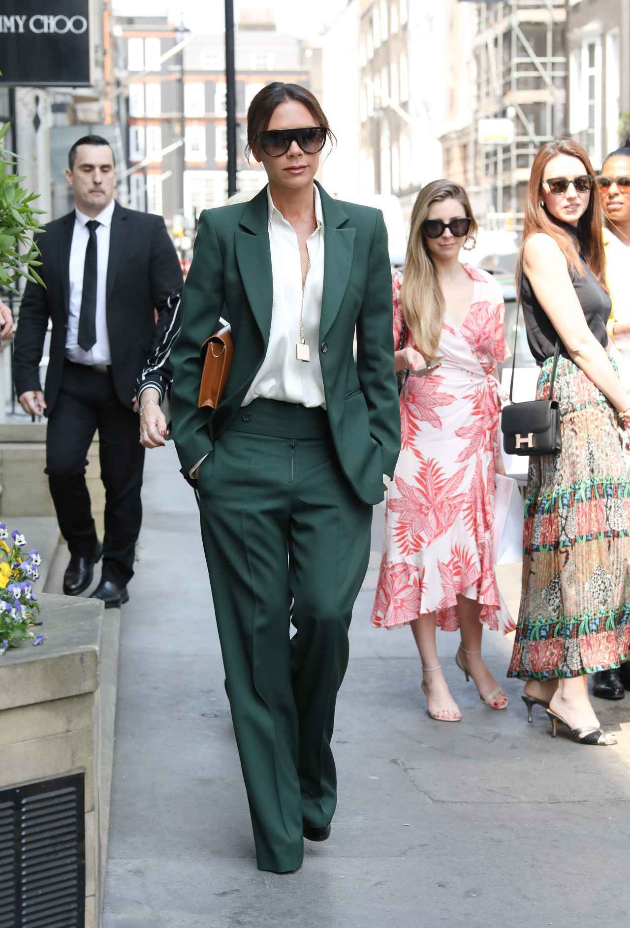 大人の余裕あふれるスタイルを得意とするヴィクトリアは、自身のブランドVictoria Beckhamから、ダークグリーンが秋らしいジャケットとパンツのセットアップを。そこにクラッチバッグを腕に挟んでエフォートレスに。