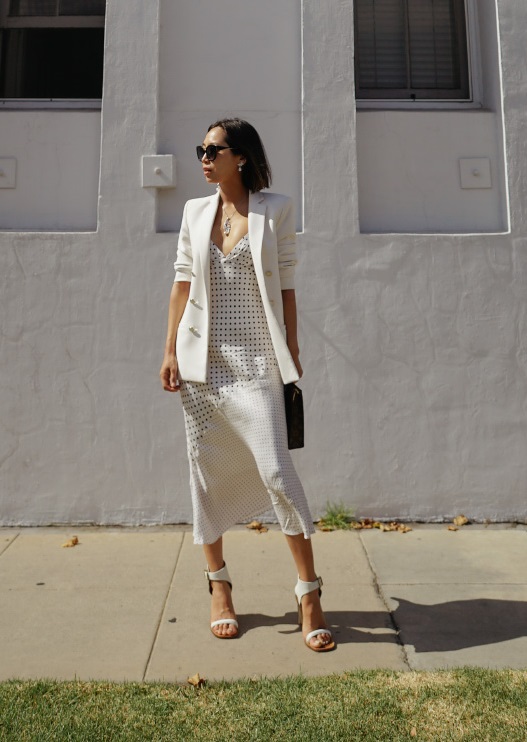 トレンドのドット柄がフェミニンなZimmermannのミディ丈ワンピースを、Mangoの白ジャケットでビジネスライクにシフト。Isabel Marantのサンダルも白で統一して爽やかに。