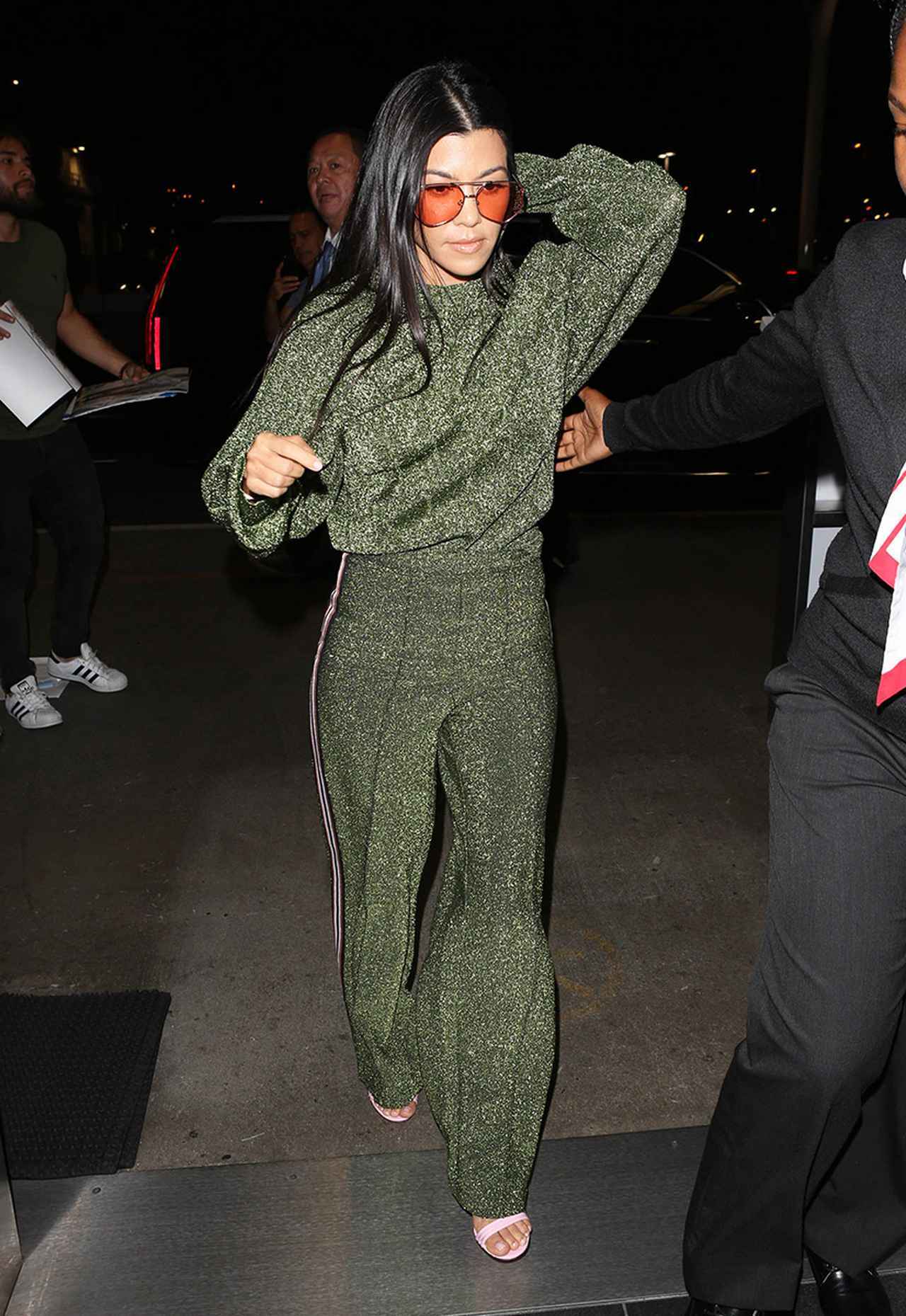 空港でキャッチされたコートニーは、上下煌びやかなニットスタイルで楽ちんに。こちらどちらもH&Mからで、トップスは50ドル(約5,500円)、パンツは55ドル(約6,050円)。Gucciのピンクのサンダルで色を添えて。