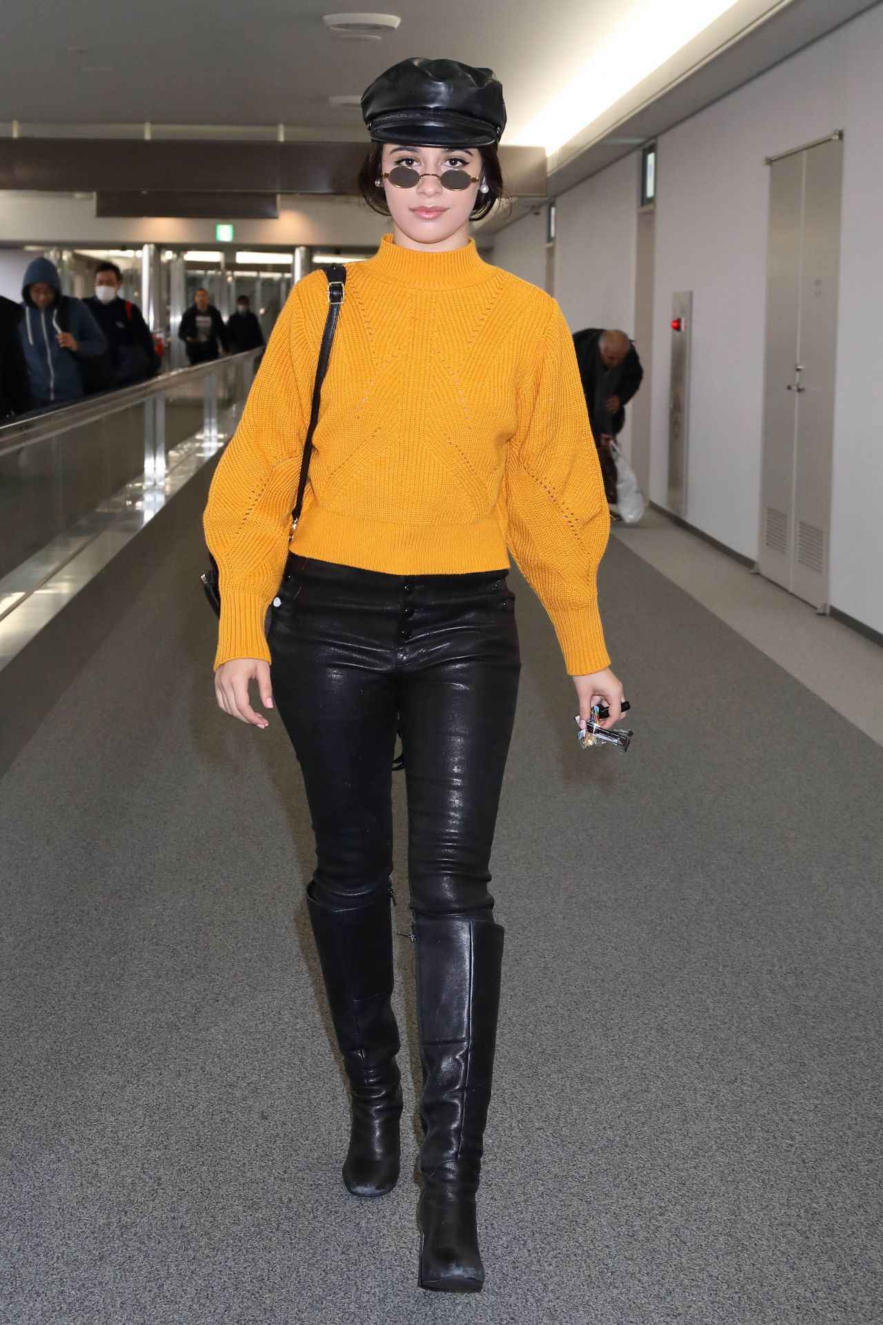 日本に来日した時にマスタードイエローのニットにレザーパンツという辛口コーデを披露したカミラ。この時被っているフェイクレザーのハットはZaraのもので、お値段は26ドル(約2,860円)。合わせてニットもTopshopで34ポンド(約5,300円)というまさにプチプラコーデ。パンツはJ Brand。