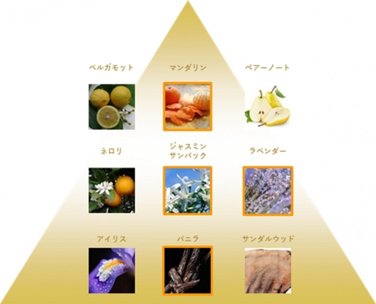トップノートのマンダリンオレンジが弾けるように軽やかに、またデリケートに香り、ベルガモットやペアーノートのフルーティーな香りと優しく溶け合う。