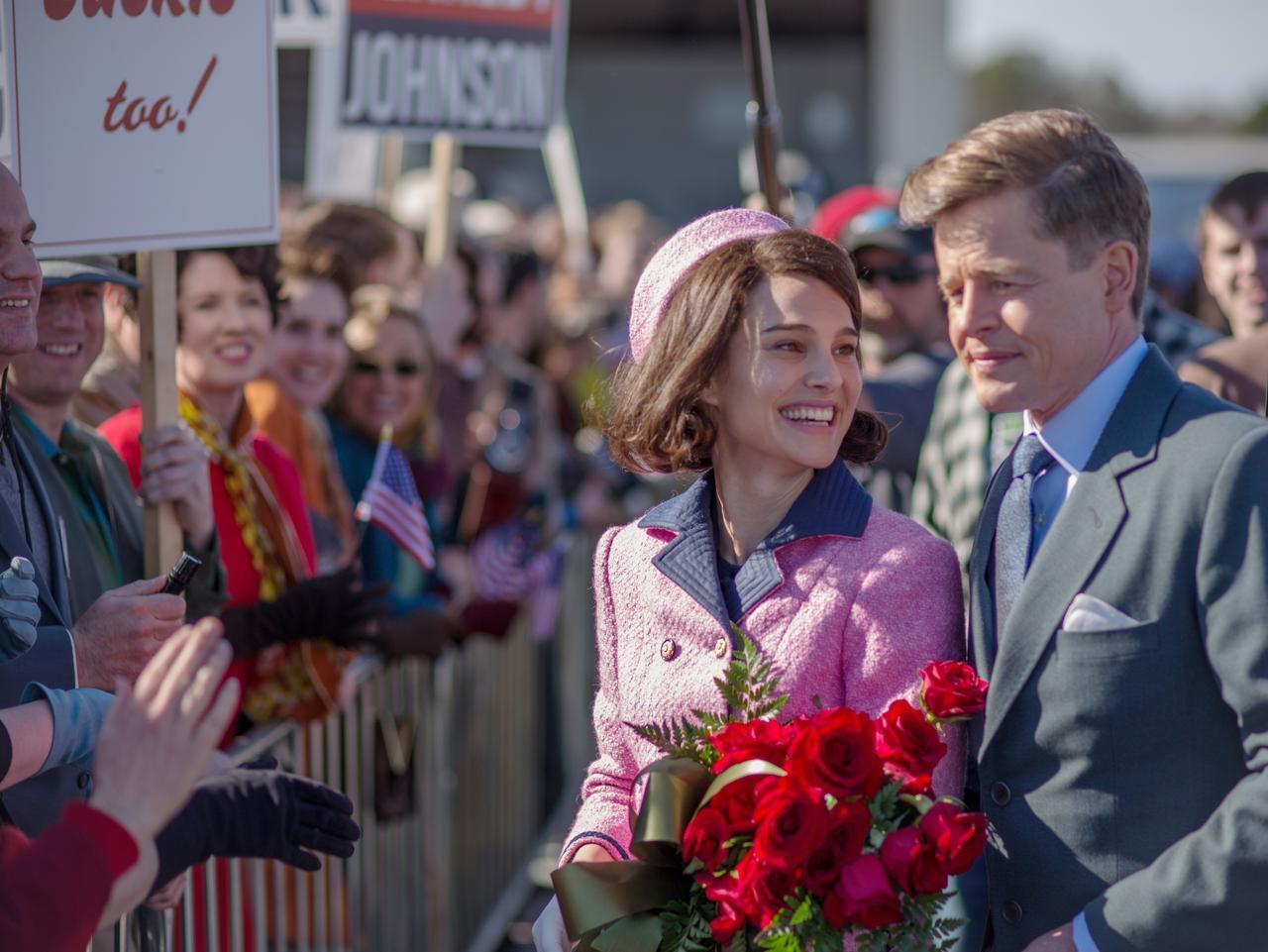 暗殺後、ジャッキーは夫の血がついたシャネルのスーツを「犯人に見せつける」と言って、着替えることなく報道陣の前に姿を見せた。©2016 Jackie Productions Limited