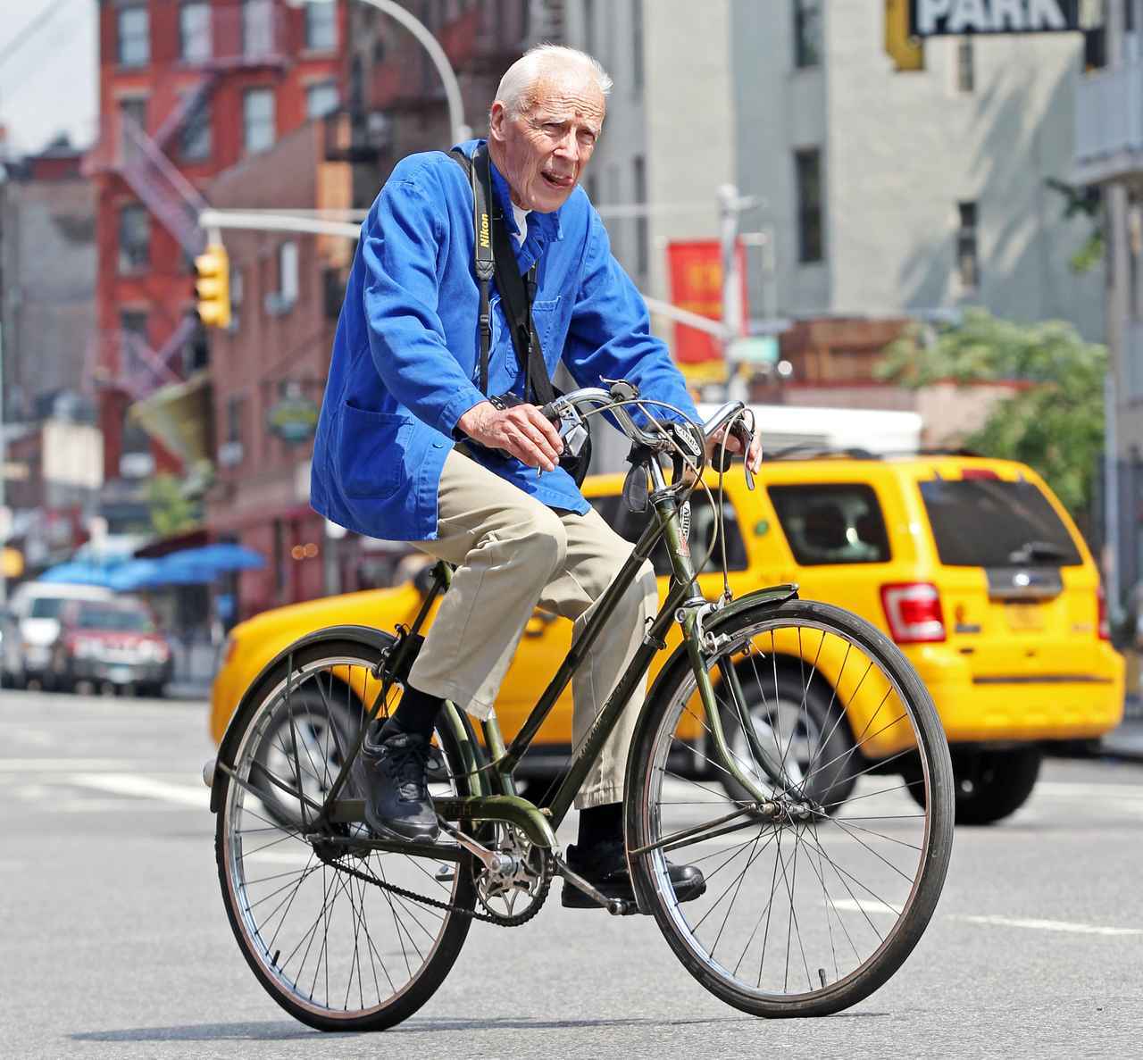 ブルーのトップスを着て、カメラ片手にコレクション会場を自転車で駆け回る姿がアイコニックな世界的ファッションフォトグラファーのビル・カニンハム。