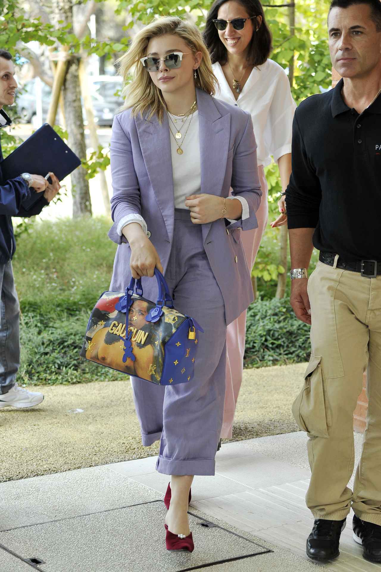 この日のクロエは、2人の女性デザイナーが2015年に立ち上げたブランドHillier Bartleyから、ライラックカラーが優しげなジャケットとパンツのスーツスタイルで。そこに合わせたバッグは、Louis Vuittonがアーティストのジェフ・クーンズとコラボしたコレクションから、モナ・リザが描かれたボストンバッグと、ベルベット素材のパープルカラーのミュールでアクセントをつけて。