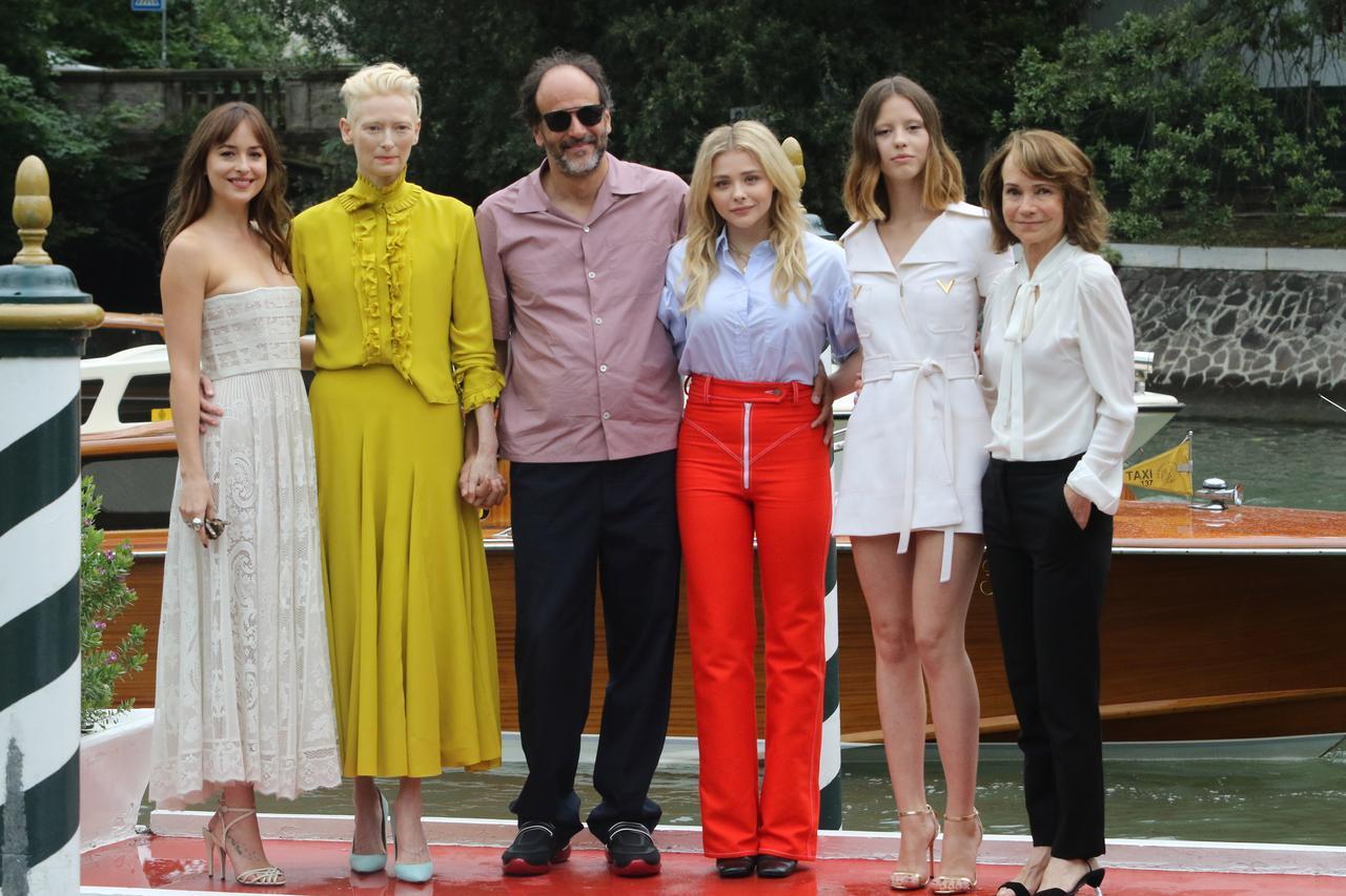 映画『サスペリア』の共演者であるダコタ・ファニング(一番左)やティルダ・スウィントン(左から2番目)らとのフォトコールでは、Simone Rochaのパフスリーブのシャツに、真っ赤なストレートパンツで視線を奪った。(フロントロウ編集部)