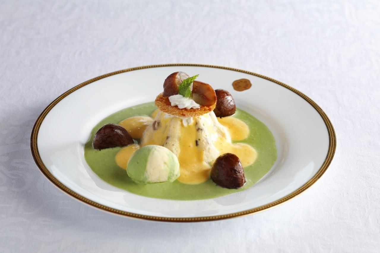 早採りした大粒の美濃栗を三温糖で渋皮煮にして、ババロアの中にも贅沢に入れ、上に乗せたオレンジピール入りのダンテル(クッキー)と食感のアクセント抹茶のソースとの相性も抜群のやさしい味わい。