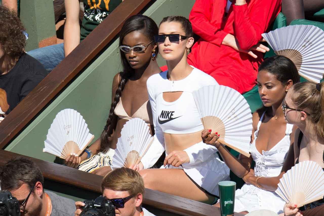 ベラ・ハディッドは、友人らとおソロいの扇子。