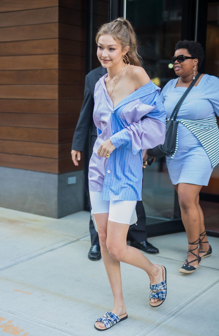 そんな注目の試合を大興奮で見守ったジジ&ベラの観戦ルックは、それぞれ「彼シャツ」のようなオーバーサイズシャツの片方の肩をはだけるという何ともセクシーなスタイル。