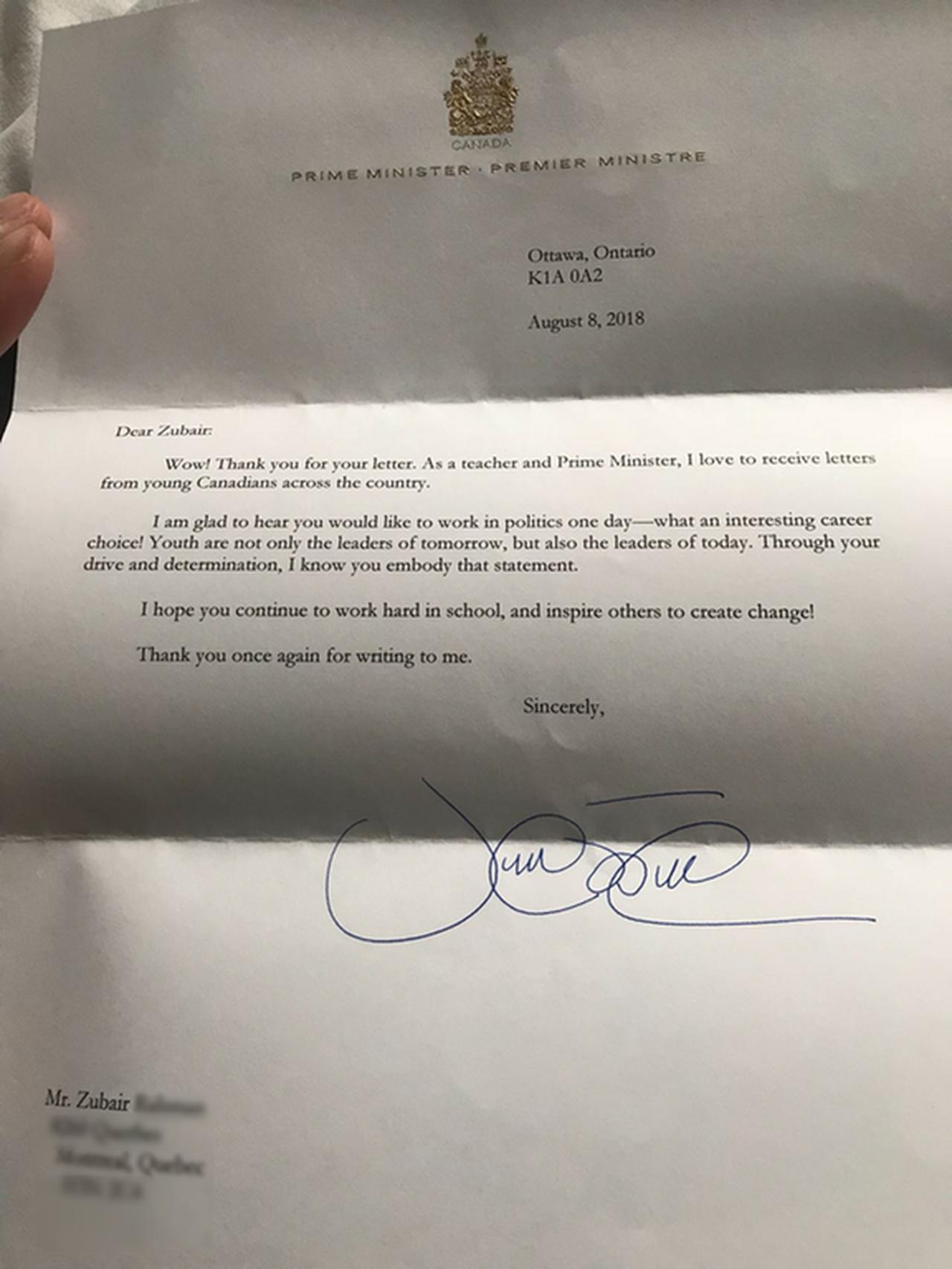ジャスティン・トルドー首相から手紙をもらったのは、カナダに暮らす9歳の少年ズバイル君。少年の家族が米掲示板サイトredditに公開した手紙には、トルドー首相から、少年を応援するこんなメッセージが書かれていた。