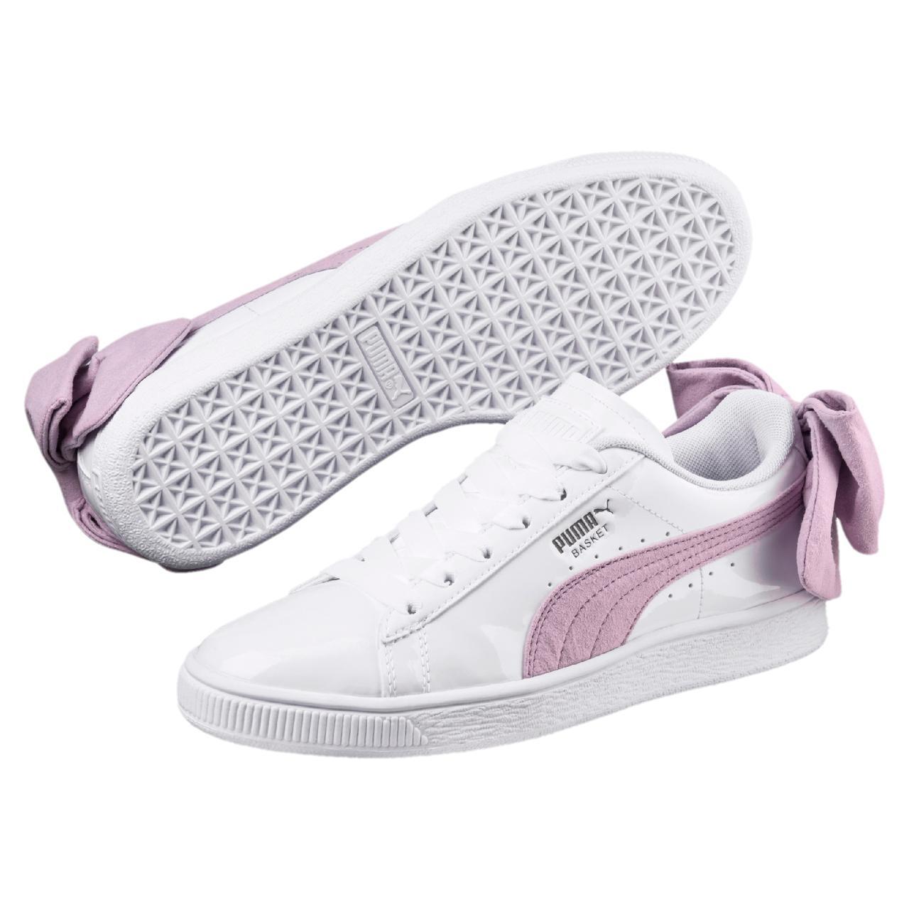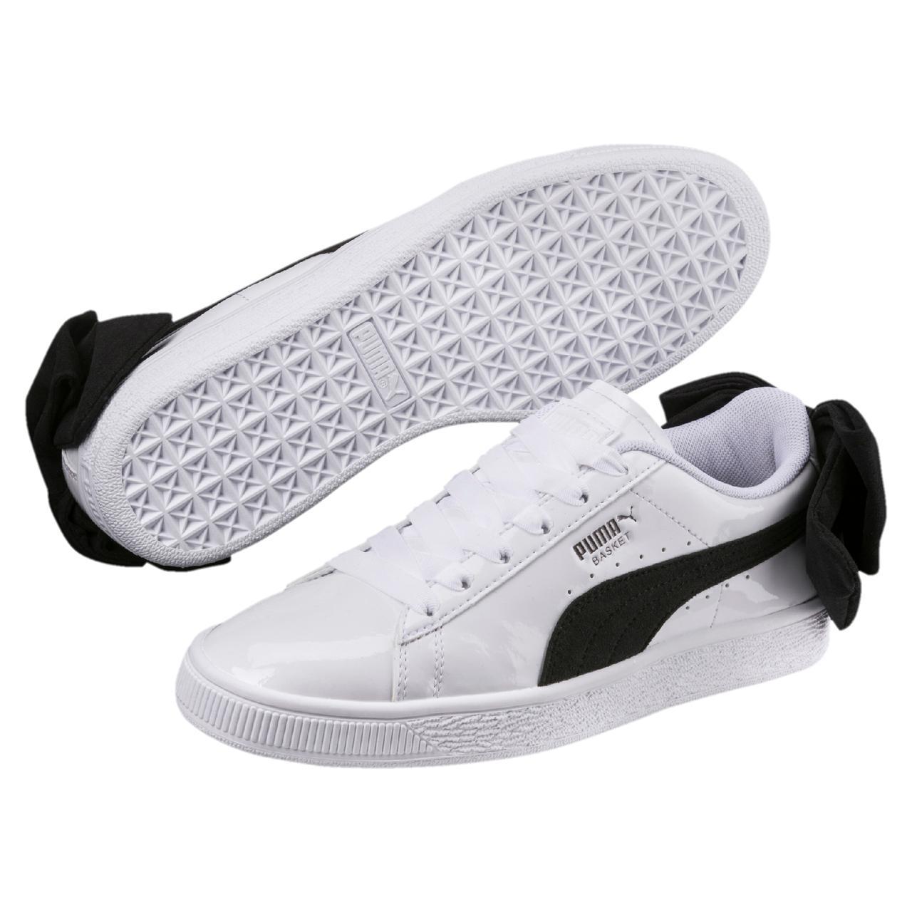 パテントレザーのプーマ バスケットのかかとに大きなリボンをあしらい、ストリートらしさを残しつつもスタイリッシュでフェミニンなルック。