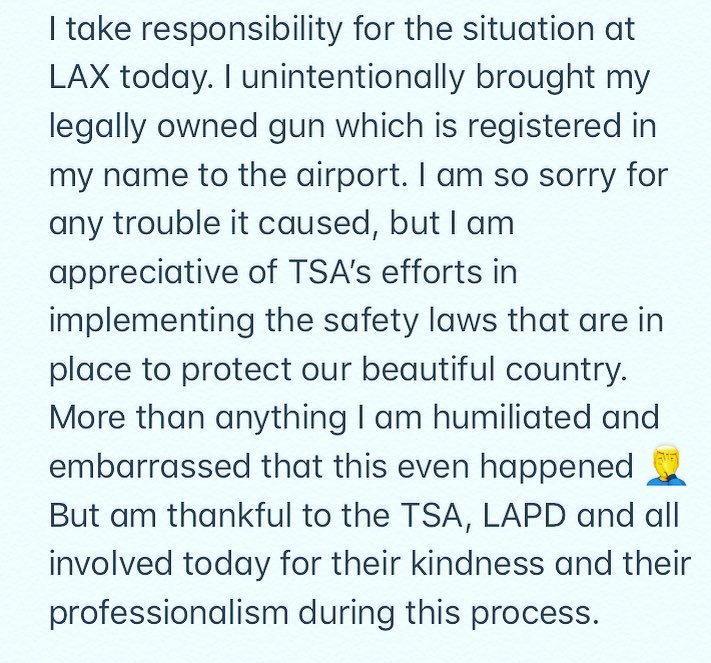 「僕はLAX(ロサンゼルス国際空港)で起きた出来事に責任を感じています。合法的に所有し、空港でも僕の名前で申請していた拳銃を、意図せずに持ち込んだことでトラブルを巻き起こしてしまい大変申し訳なく思っています。我が国を守るためにある安全な法律に努めるTSA(運輸保安庁)に感謝します。こんなことが起きてしまい、屈辱であり恥ずかしい気持ちですが、TSAやLAPD(ロサンゼルス市警察)をはじめとした関係者が親切かつプロフェッショナルな手続きをしてくださったことに感謝します」