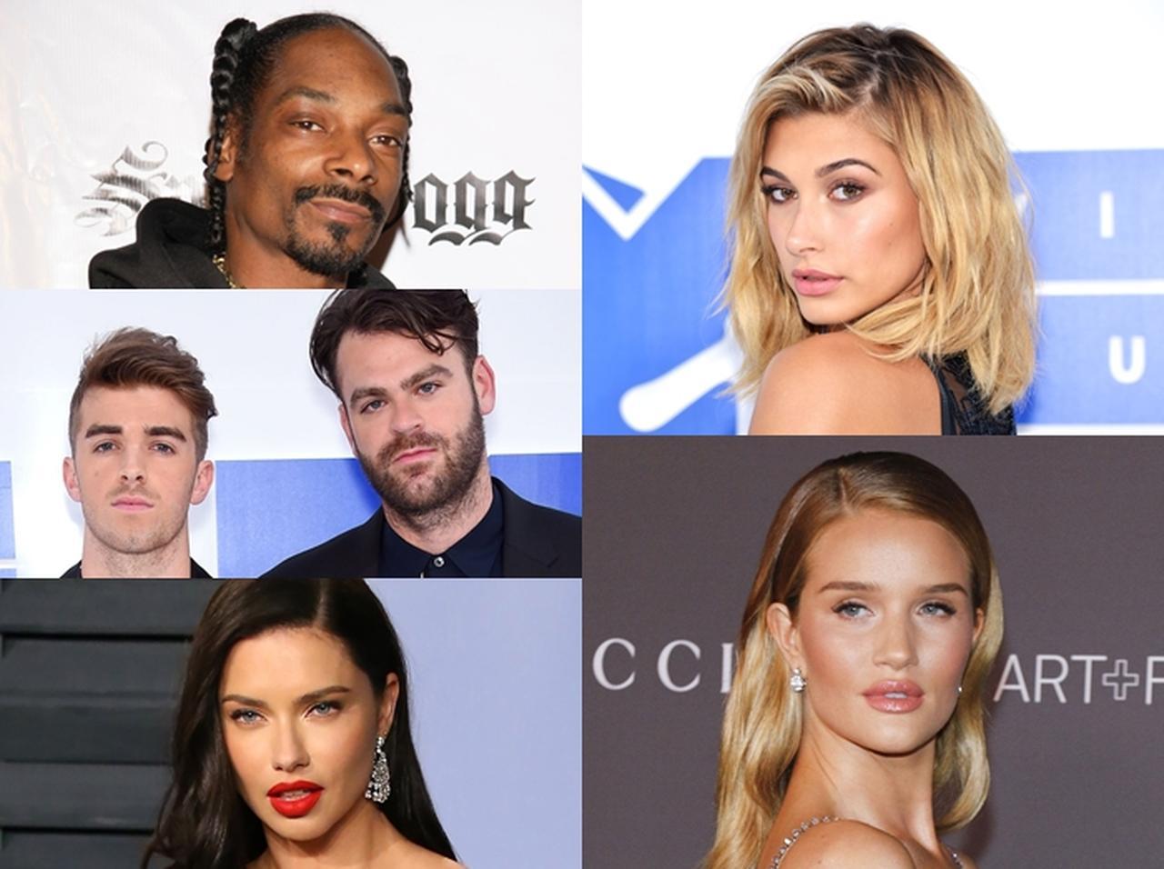 左から時計回りに、スヌープ・ドッグ、ヘイリー・ボールドウィン、ロージー・ハンティントン・ホワイトリー、アドリアナ・リマ、ザ・チェインスモーカーズ。