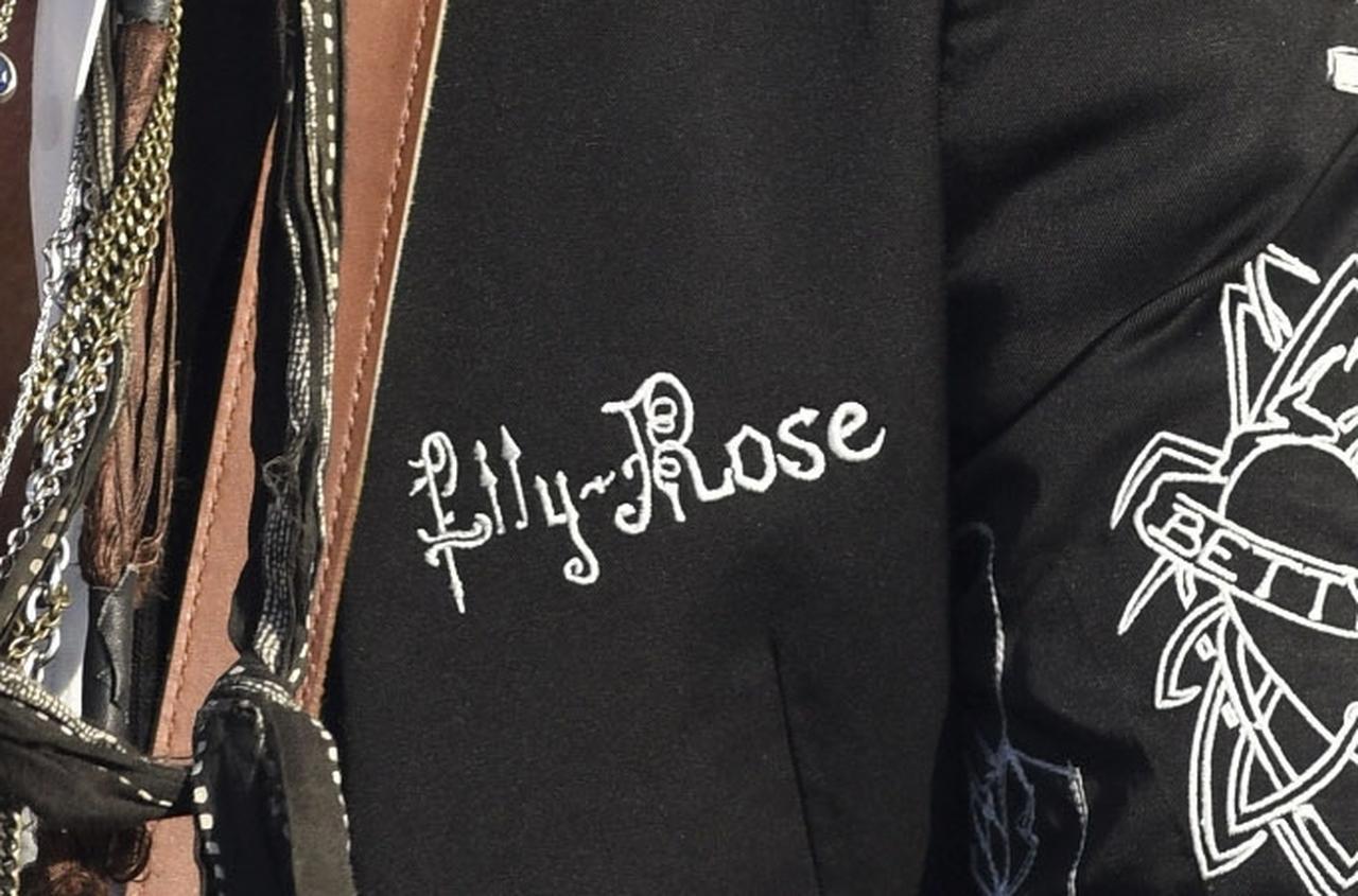 この黒のジャケットには、様々なデザインが施されており、その中で注目するのは左胸の文字。そこには、ジョニーの娘でありモデルのリリー・ローズ・デップの名前。この文字は、実際に自分の左胸に入っており、ジャケットに描かれたリリーの名前は、タトゥー同じ位置に書かれ、フォントもタトゥーと同じ。