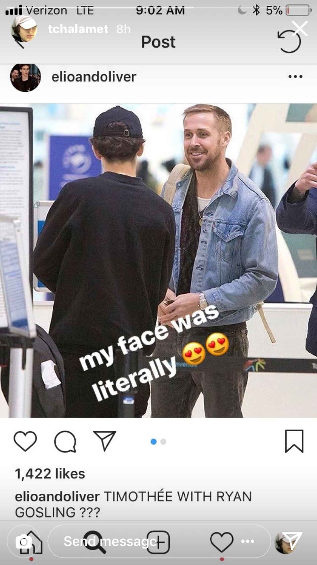 そこには、『ラ・ラ・ランド』のライアン・ゴズリングと、ティモシーの後ろ姿が写っており、ティモシーがプライベートでライアンに遭遇した時に、目がハートになるくらい興奮したことを明かした。