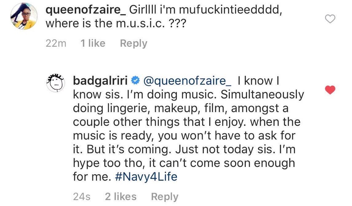 そんななか、あるファンが業を煮やした様子でリアーナのインスタグラムの投稿の1つに「ガール! もう待ちくたびれたよー‼ 新曲はどこ???」と荒っぽくコメント。