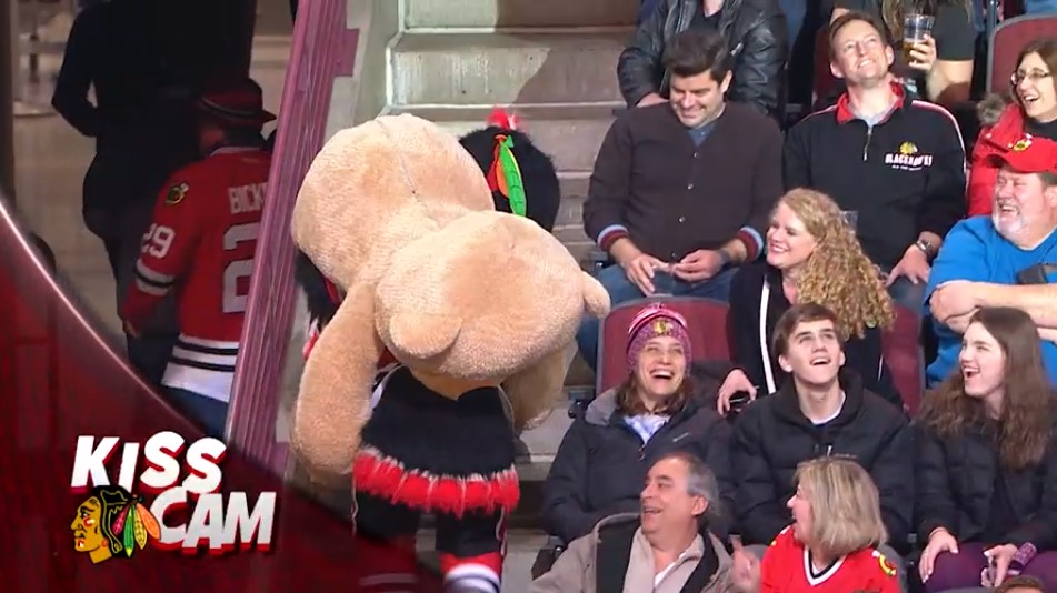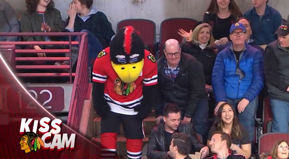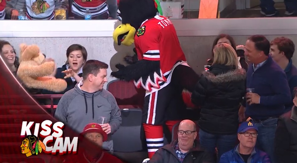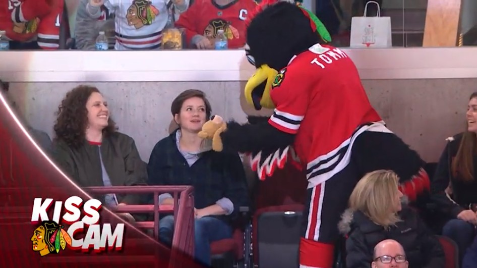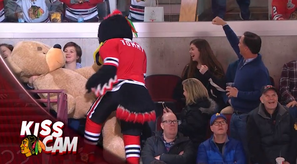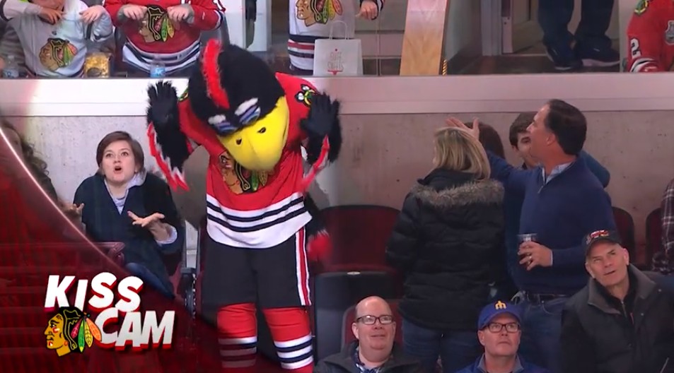 今回紹介したいのは、2018年2月のシカゴ・ブラックホークスの試合で行われたキスカム。会場のビッグスクリーンに映し出されたカップルは喜んでキスをしていき、この日もキスカム企画は盛り上がっていたのだが、シカゴ・ブラックホークスのマスコットであるトミーホークが登場したところで風向きに変化が。