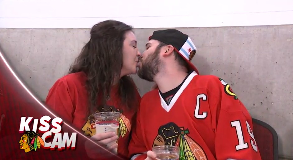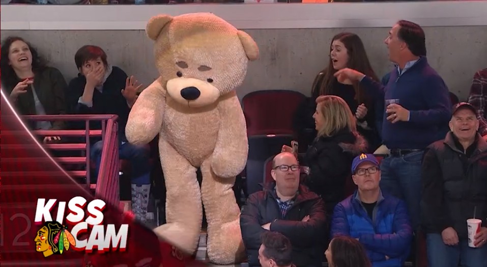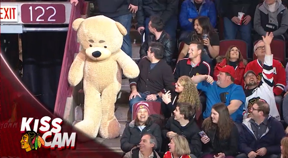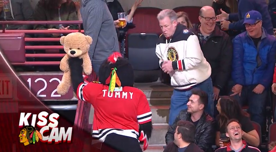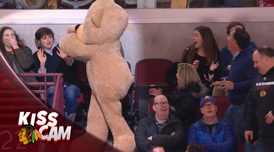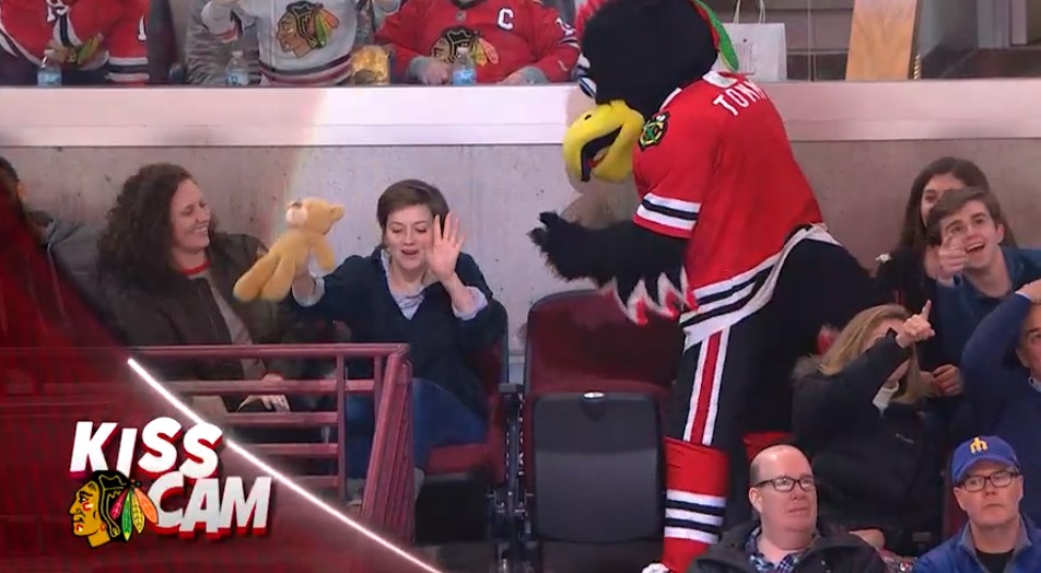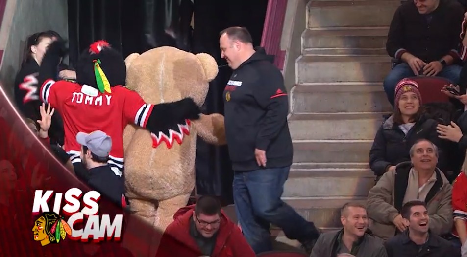今回紹介したいのは、2018年2月のシカゴ・ブラックホークスの試合で行われたキスカム。会場のビッグスクリーンに映し出されたカップルは喜んでキスをしていき、この日もキスカム企画は盛り上がっていたのだが、シカゴ・ブラックホークスのマスコットであるトミーホークが登場したところで風向きに変化が。