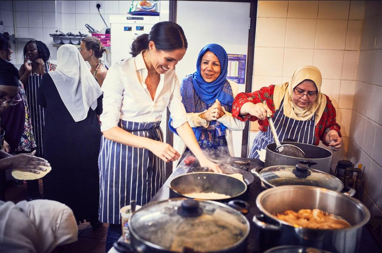 ハブ・コミュニティ・キッチンの女性たちの指導の下、料理の腕を振るうメーガン妃。©Kensington Palace/ Twitter