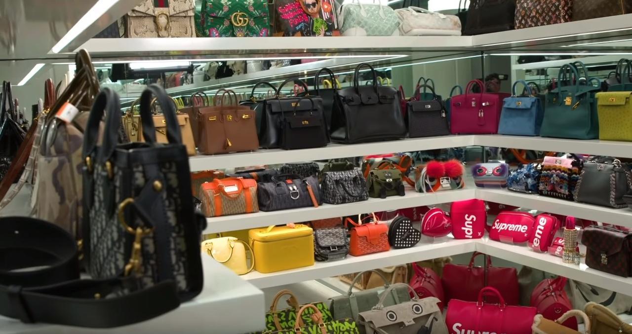 1人が使うクローゼットでも十分足りるほどの広さを誇るウォークイン・クローゼットの中には、シャネル(Chanel)やディオール(Dior)、ルイ・ヴィトン(Louis Vuitton)やエルメス(Hermes)といった高級ブランドのバッグがずらり。