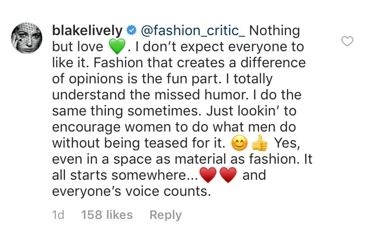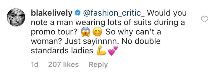 ブレイク・ライブリーが「最近スーツばかり着すぎ」との皮肉コメントに小気味良い反撃をお見舞いした。