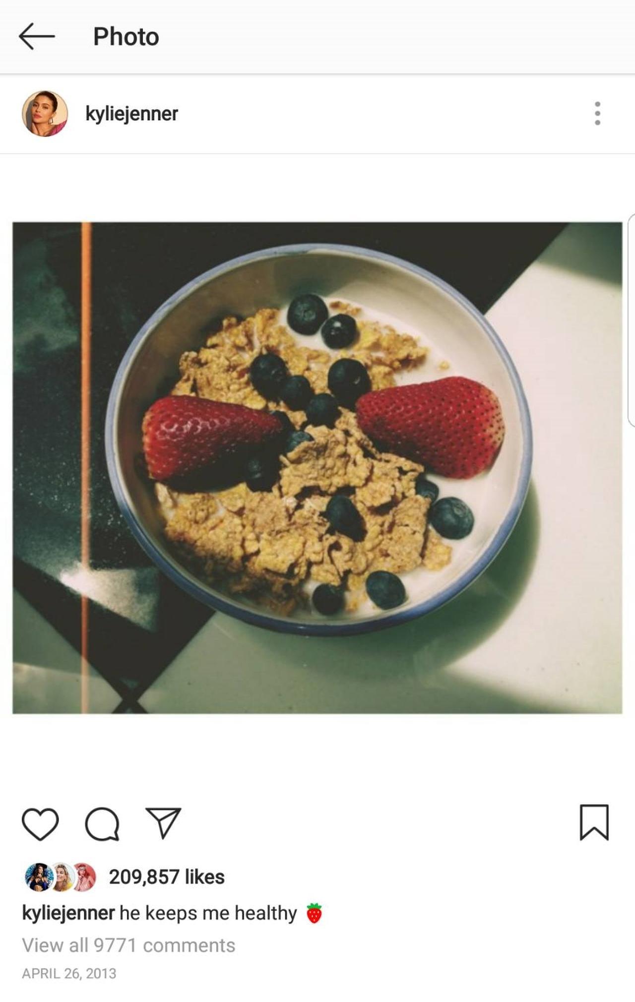 そんなカイリーにある疑惑が浮上。それは、実はシリアルを牛乳に入れて食べたことがあるのでは?という疑惑。その疑惑の発端となったのは、さかのぼること2013年。その時のカイリーのインスタグラムを見てみると「健康的にしてくれるの」とのコメントと一緒にシリアルの写真が。