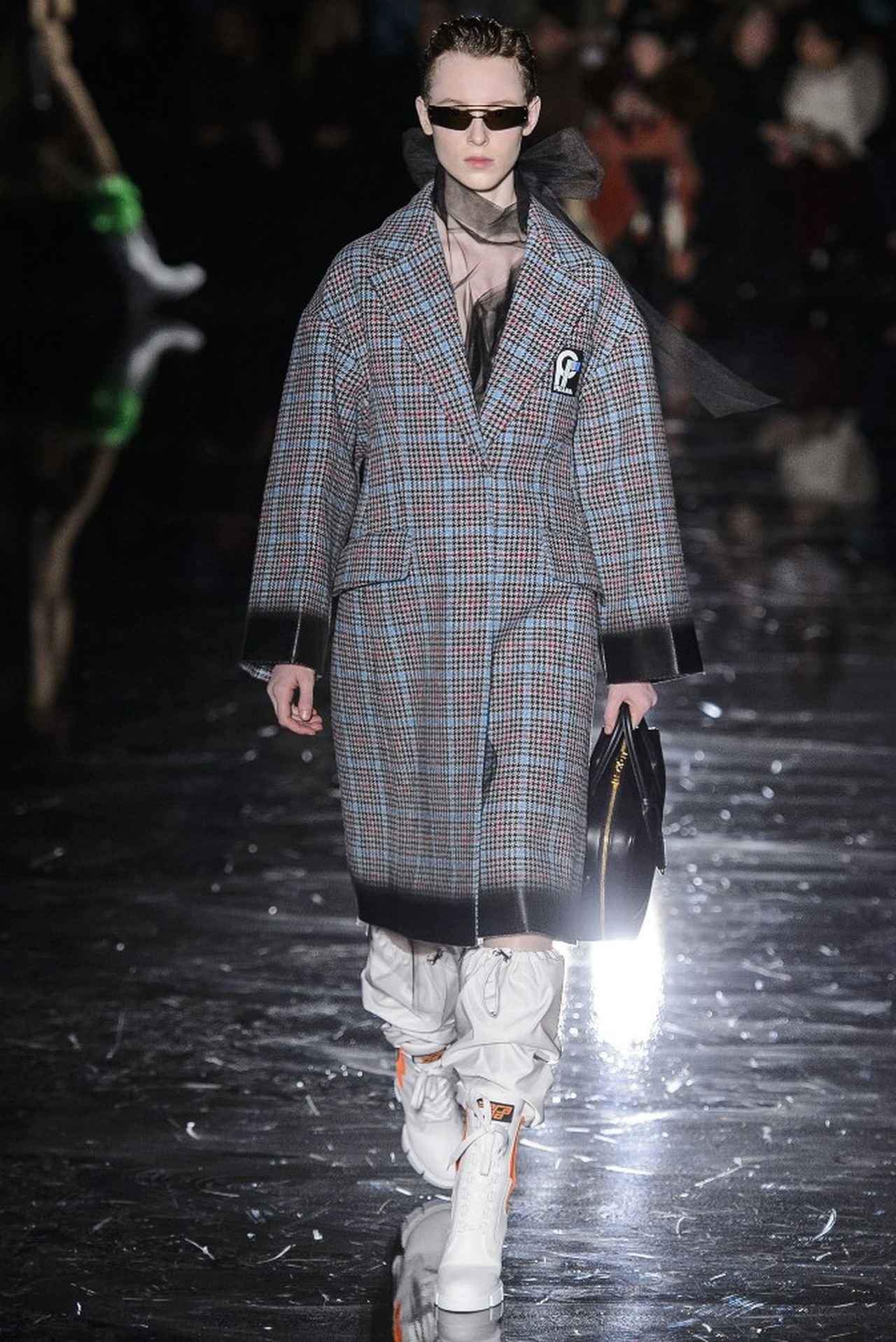 丸みを帯びたコクーンシルエットのオーバーサイズコートに、Prada(プラダ)らしいライトブルーのチェックがフェミニンさをプラスした今年らしいデザイン。