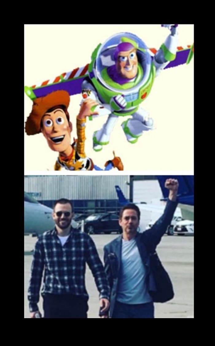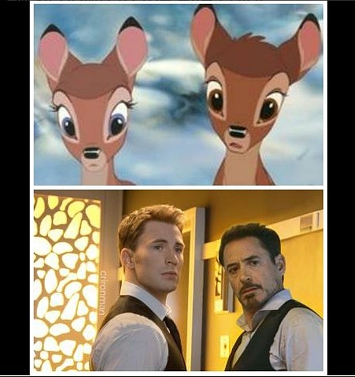 ロバートはツイッターに、スティーブ・ロジャー(キャプテン・アメリカ)とトニー・スターク(アイアンマン)の2ショット写真と、『バンビ』に登場するバンビとファリーンがコラージュされた写真を投稿。