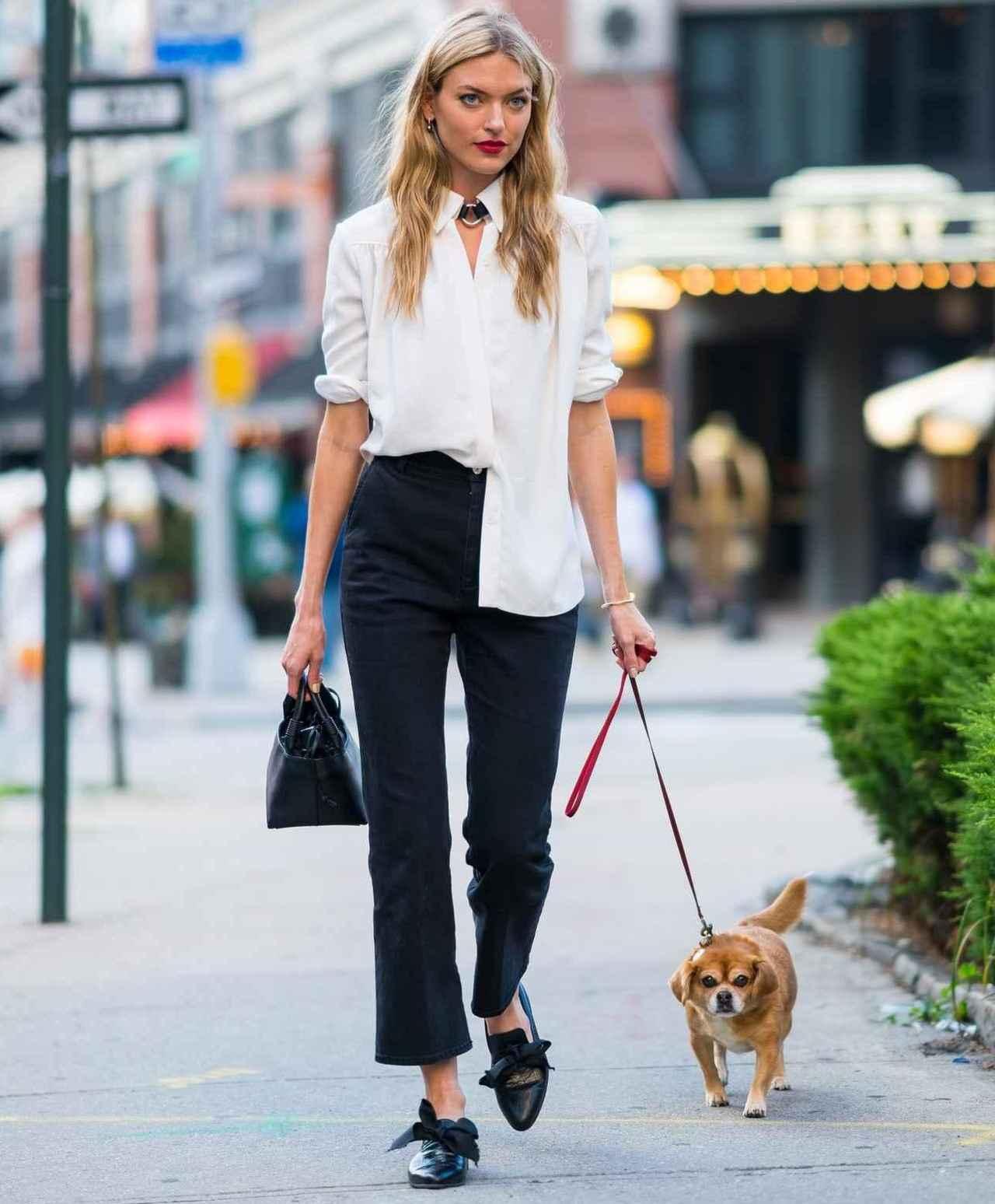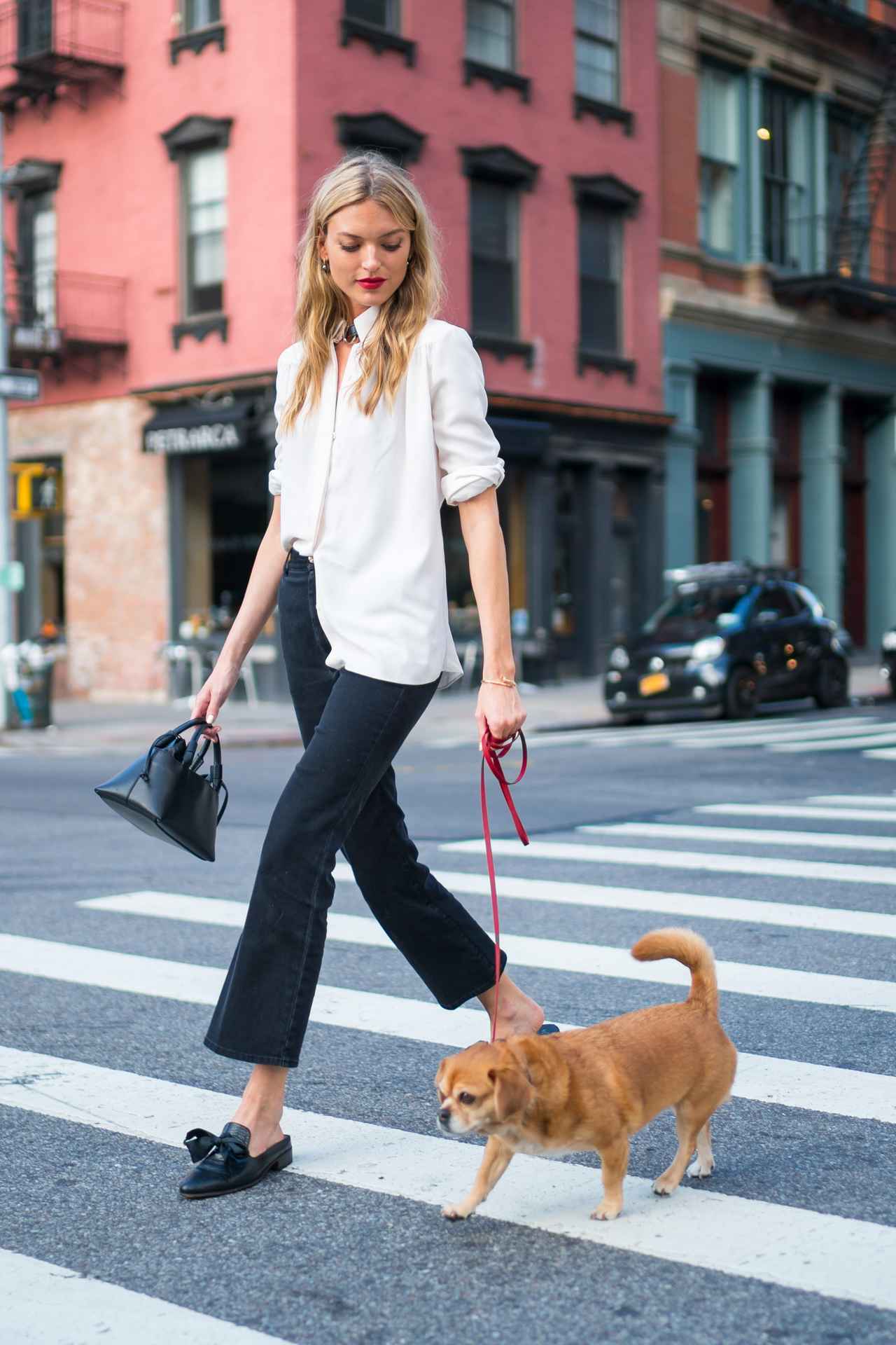 ヴィクトリアズ・シークレットなどで活躍する人気モデルのマーサ・ハントは、シンプルな白シャツを黒のトラウザーとフラットシューズでまとめた、洗練アーバンスタイルで愛犬の散歩へお出かけ。