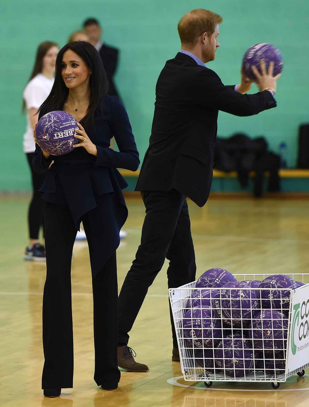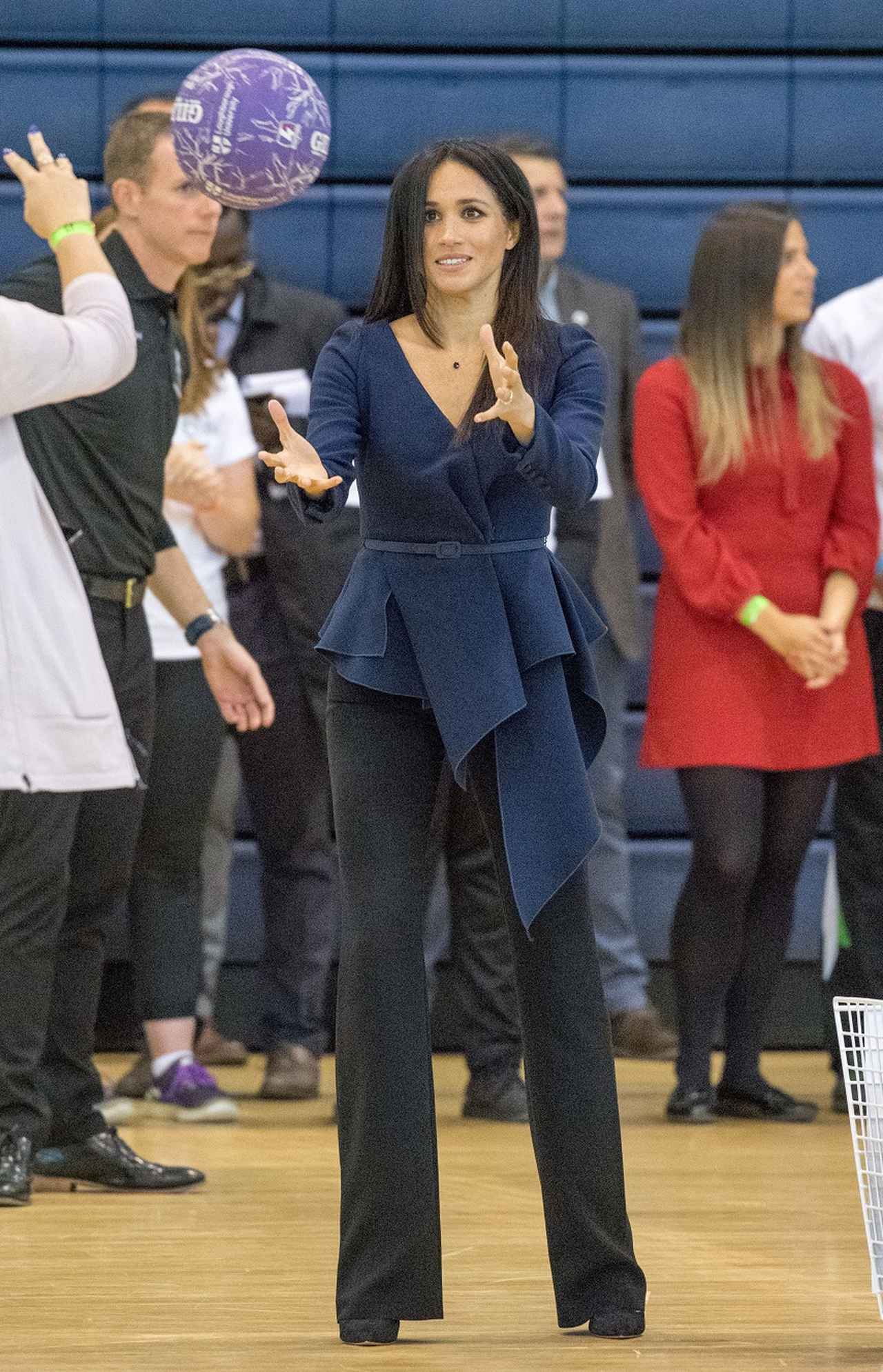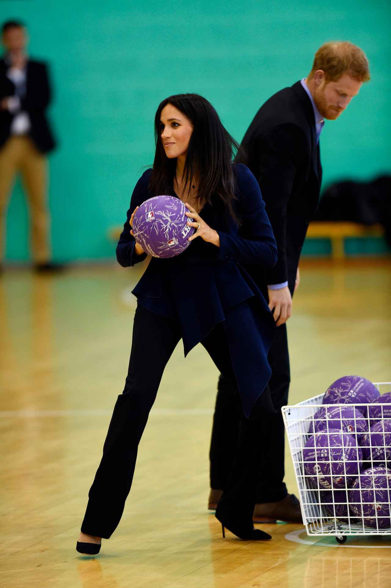 バスケットボールよりも一回りほど小さいボールを投げたりキャッチしたりしながらネットボールを楽しんだメーガン妃だったが、その足元には推定5センチ以上あるピンヒールを着用。