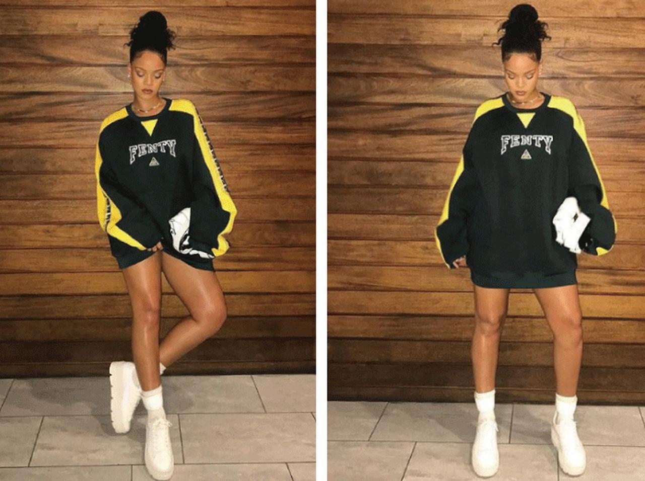世界的シンガーのリアーナは、自身がデザインしたPuma Fenty By Rihanna(プーマ バイ フェンティ)のスウェットを1枚着して、ボリューミーな同ブランドのストラップスニーカーでバランスをとって。