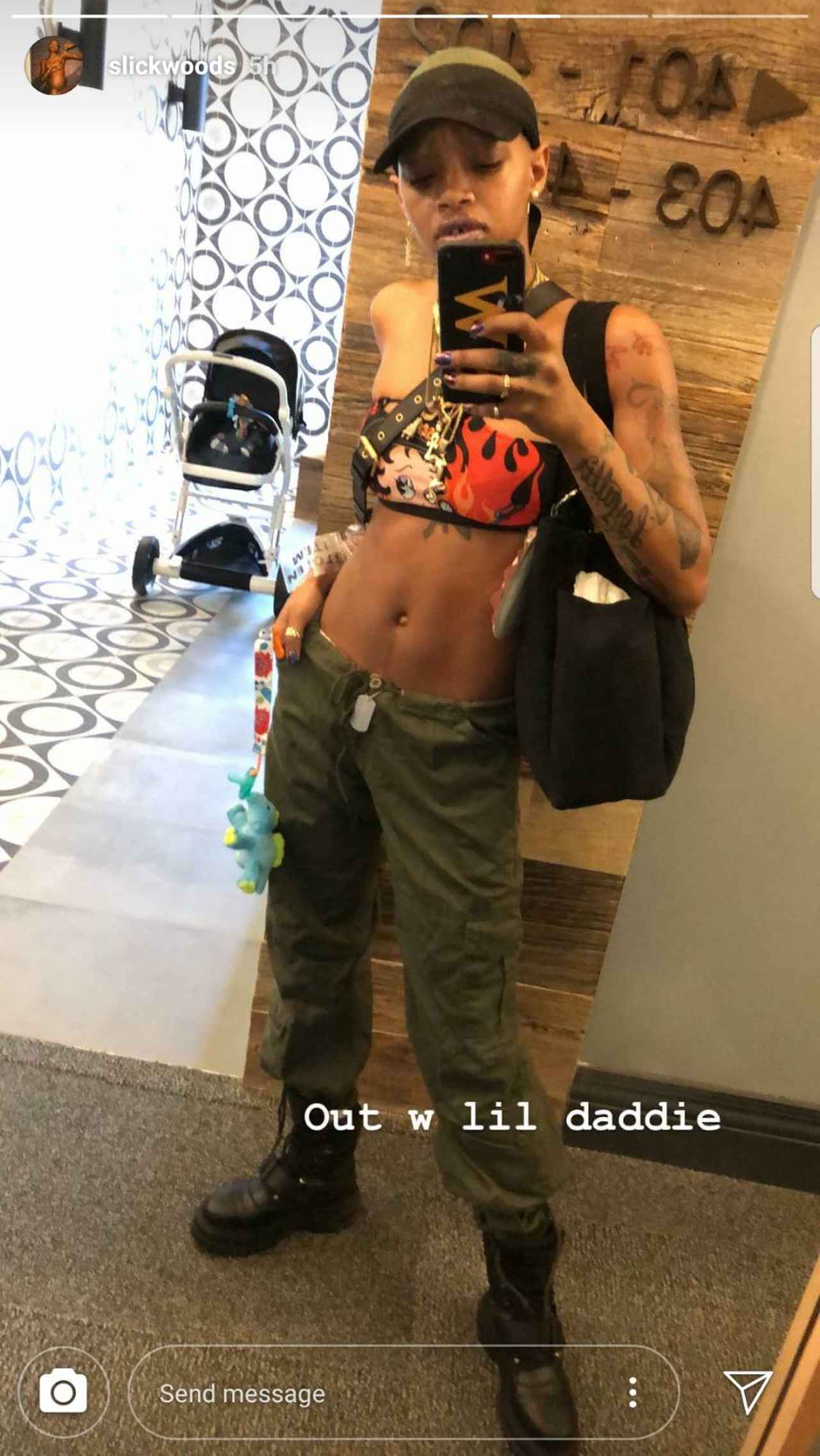 そんなスリックがインスタグラムにある1枚の写真を投稿。その写真には、ベビーバッグを持ち、腰にはおしゃぶりをぶら下げ育児に奮闘しているものの、産後2週間とは考えられないくらいスラリとしたボディのスリックの姿が。