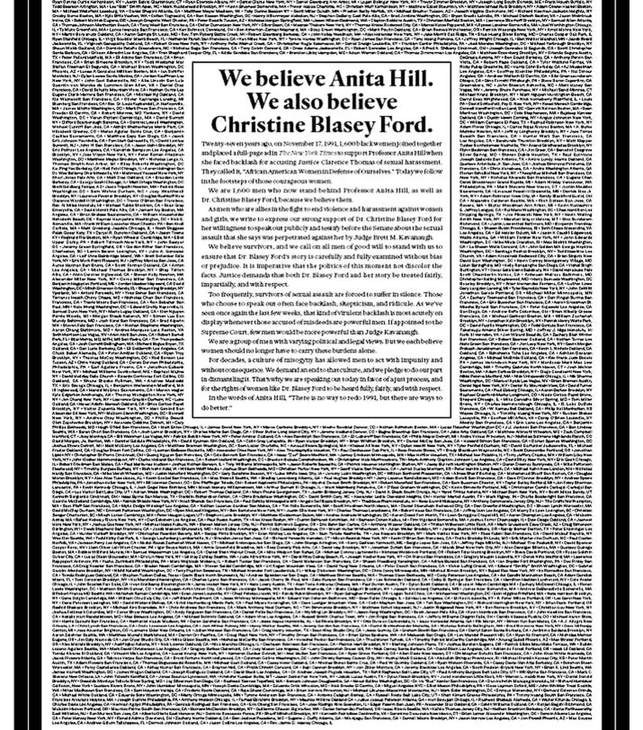 1991年にアニタ・ヒルの騒動が起きた時には、1,600人の女性がアニタ・ヒルを支持するために今回と同じような広告を米New York Timesに掲載したのだが、今回の広告はそんな女性の行動にインスパイアされた1,600人の男性たちがクリスティン・ブラジー・フォードへの支持を表明するために出した広告なのだ。広告掲載の費用は、クラウドファンディングによって集められたという。