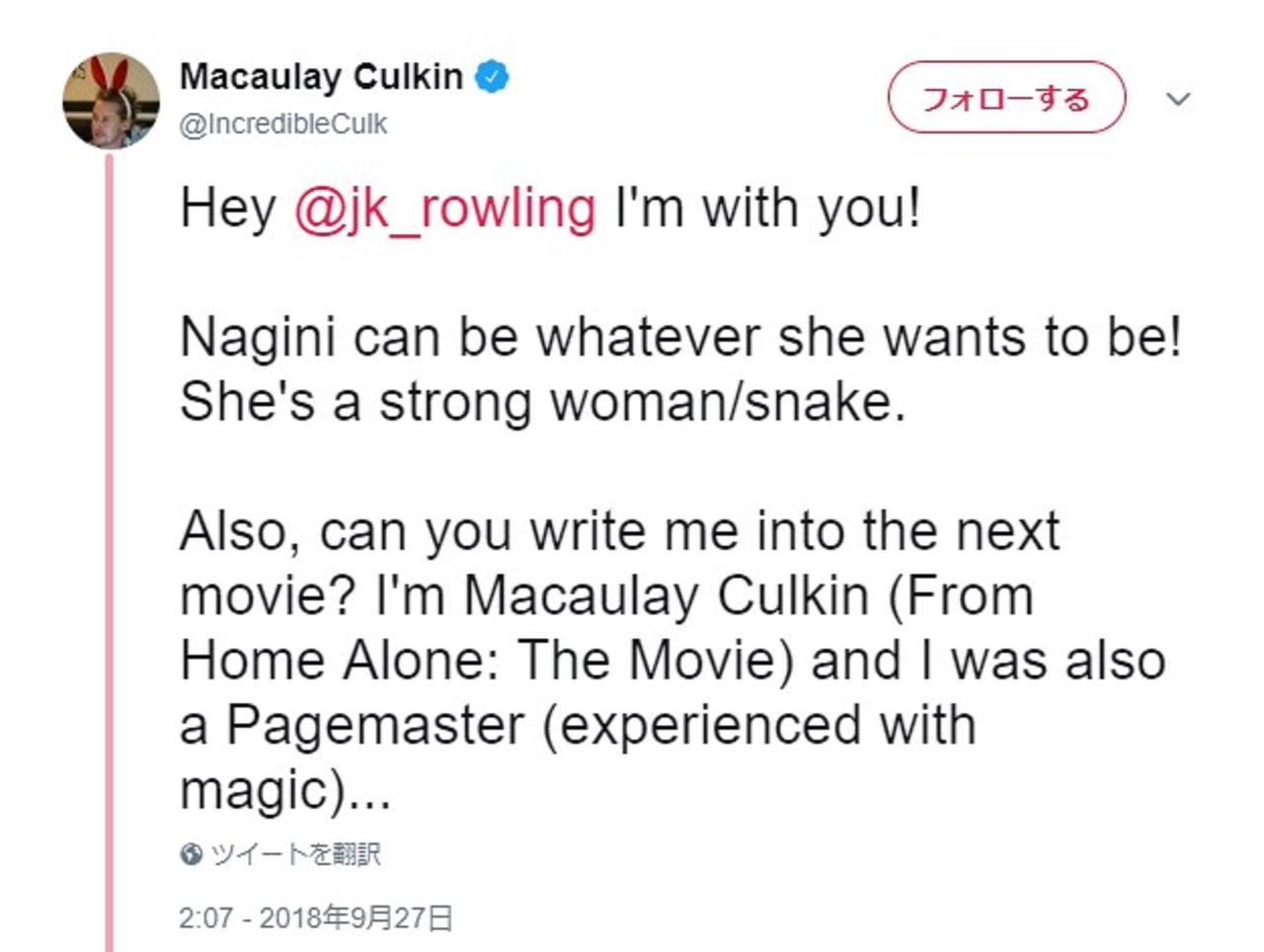 映画ホーム・アローン』などで知られる俳優のマコーレー・カルキンが、『ハリー・ポッター』(以下『ハリポタ』)シリーズへの出演を原作者であるJ・K・ローリングにツイッターを通じて直談判した。