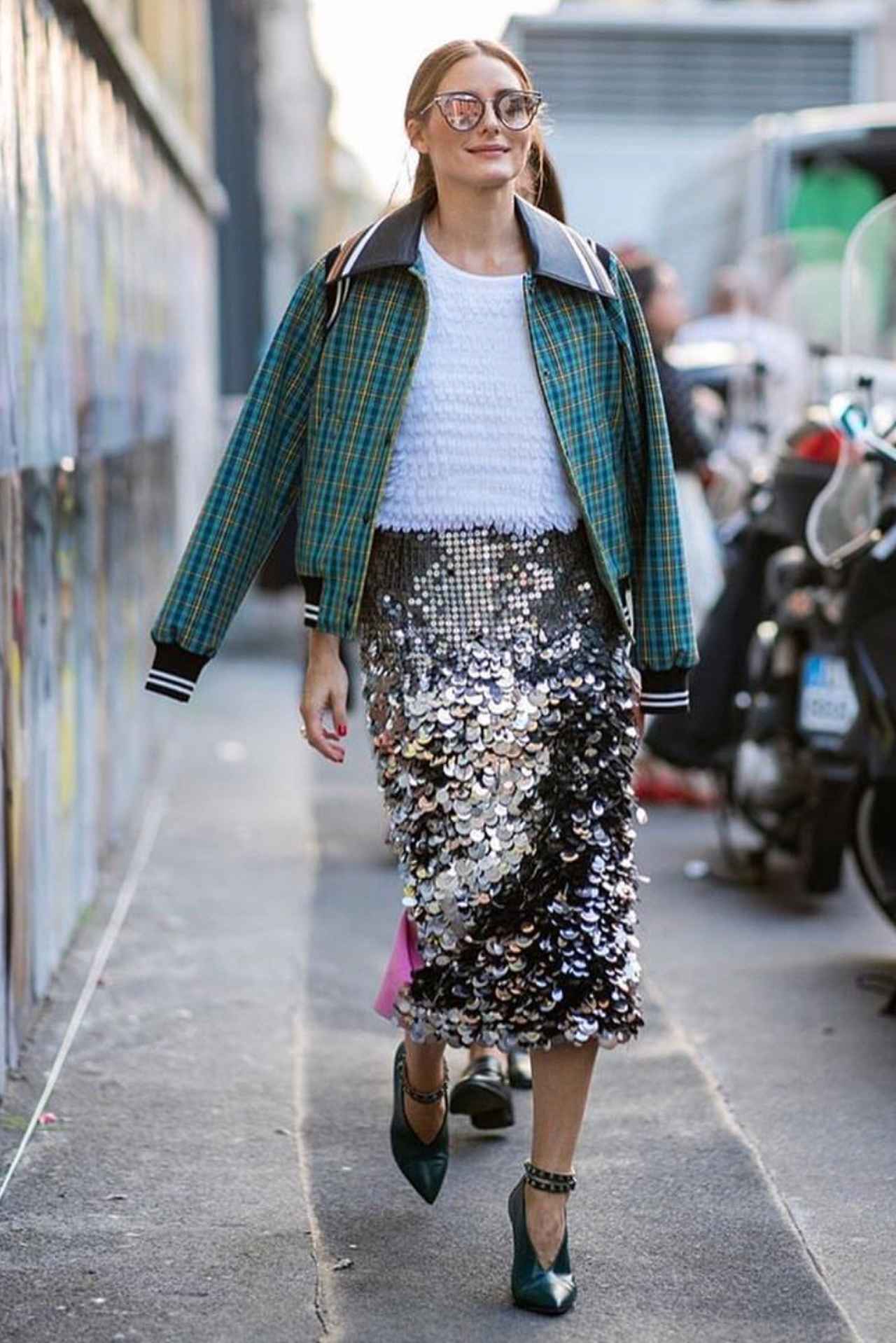 スパンコールが輝く煌びやかなスカートを、トレンドのチェック柄ブルソンで絶妙にカジュアルダウンしたオリヴィア。ブルゾンの色に合わせたモスグリーンのブーティは長年愛用しているJimmy Chooのもの。