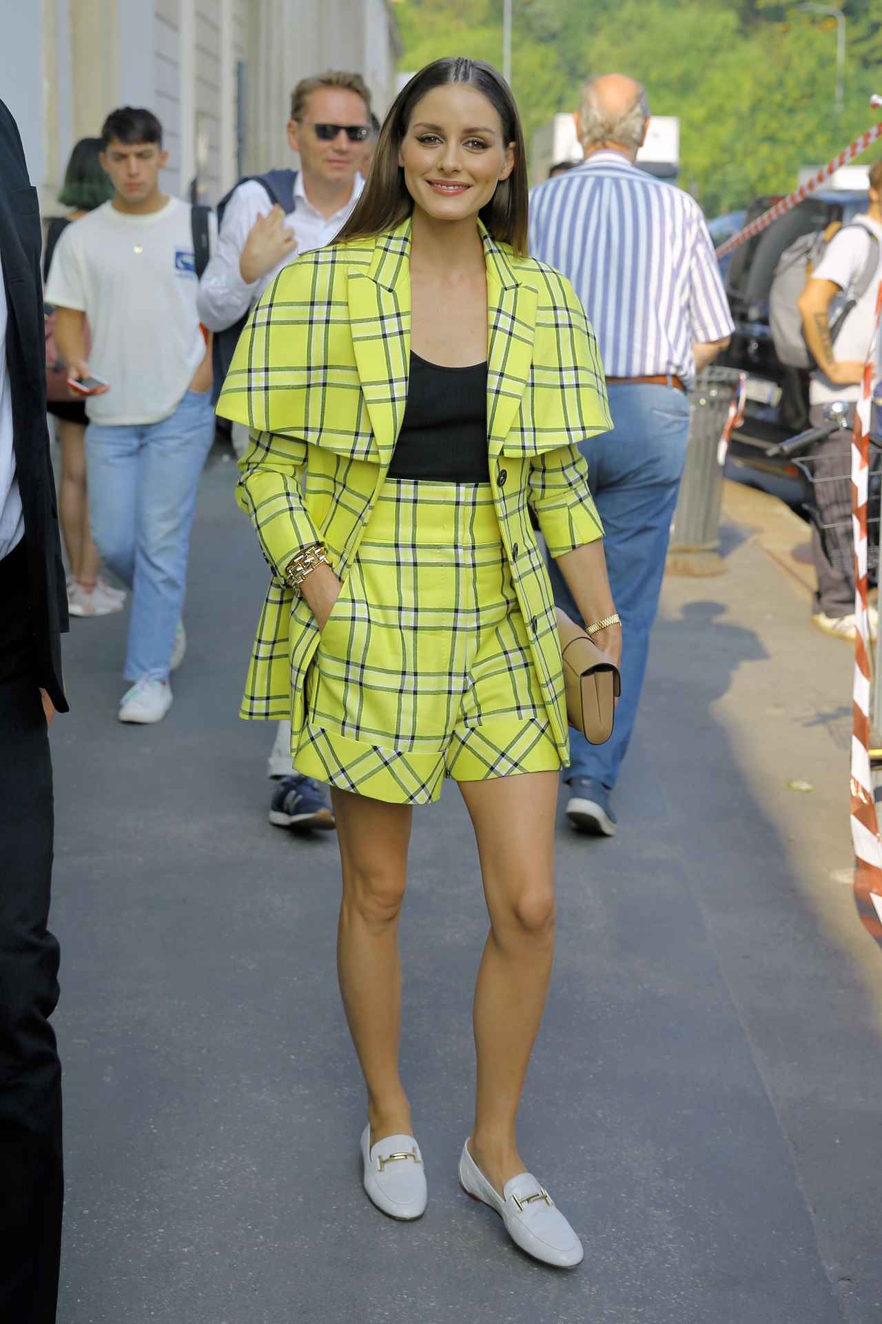 Sara Battaglianoのネオンがかったイエローのチェック柄セットアップで一際目立っていたオリヴィア。足元はTod’sのフラットシューズでエフォートレスにフィニッシュ。