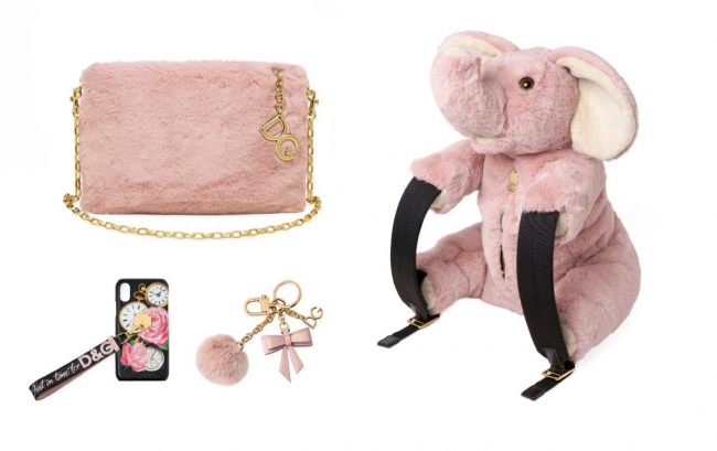 上質なエコファーを用いたアイテムにも注目。ミニバッグ「クレオ」、エコファーのポンポン、レザーのリボンモチーフ、「DG」イニシャルロゴを象ったメタルのコンビネーションが特長のキーチャームの他、エレファントモチーフのバッグパックなど、多くのバリエーションが揃う。