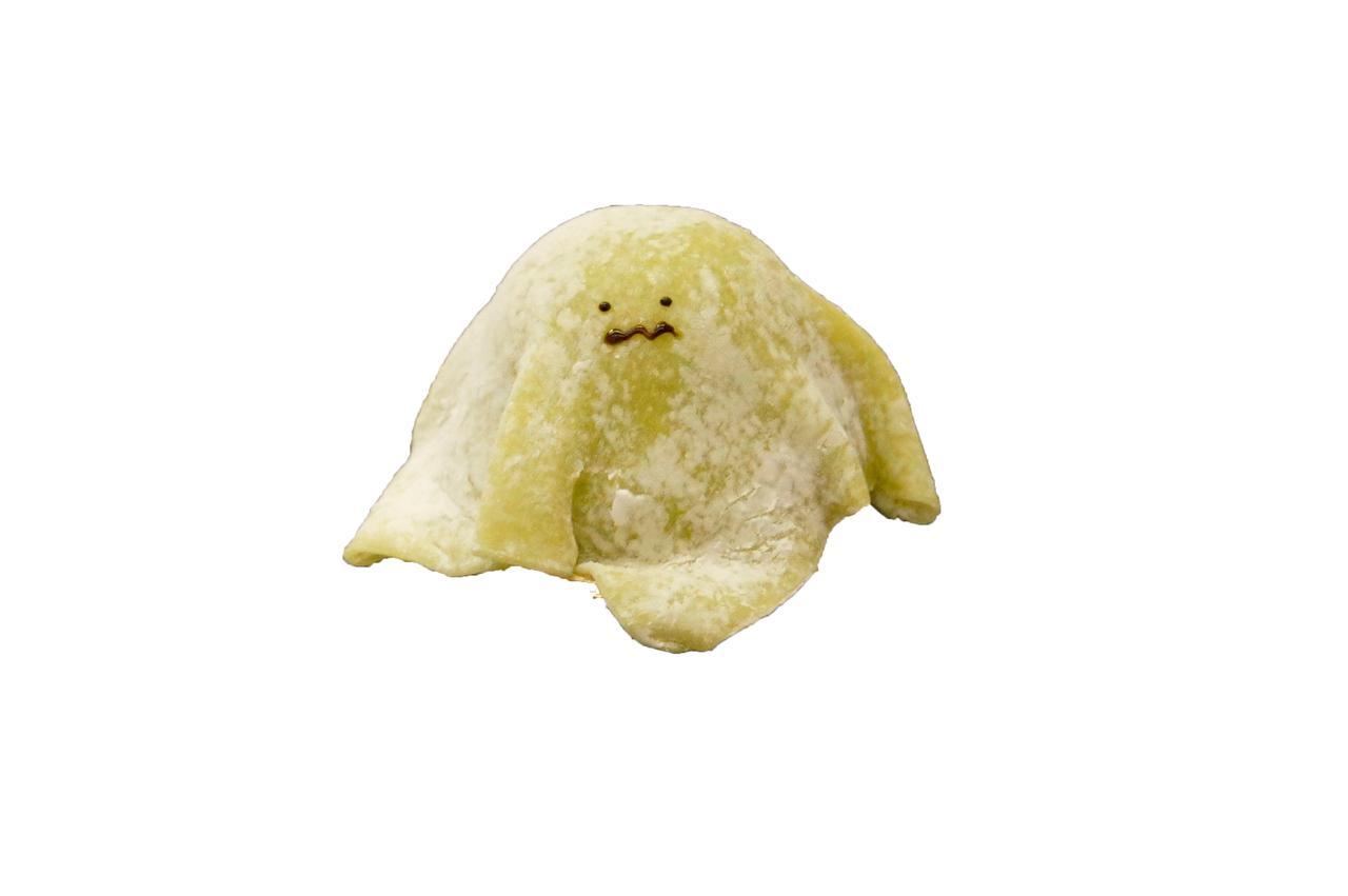 抹茶ムースの中に粒あんを忍ばせ、抹茶ぎゅうひで包んだ、かわいいおばけをモチーフにした1品。