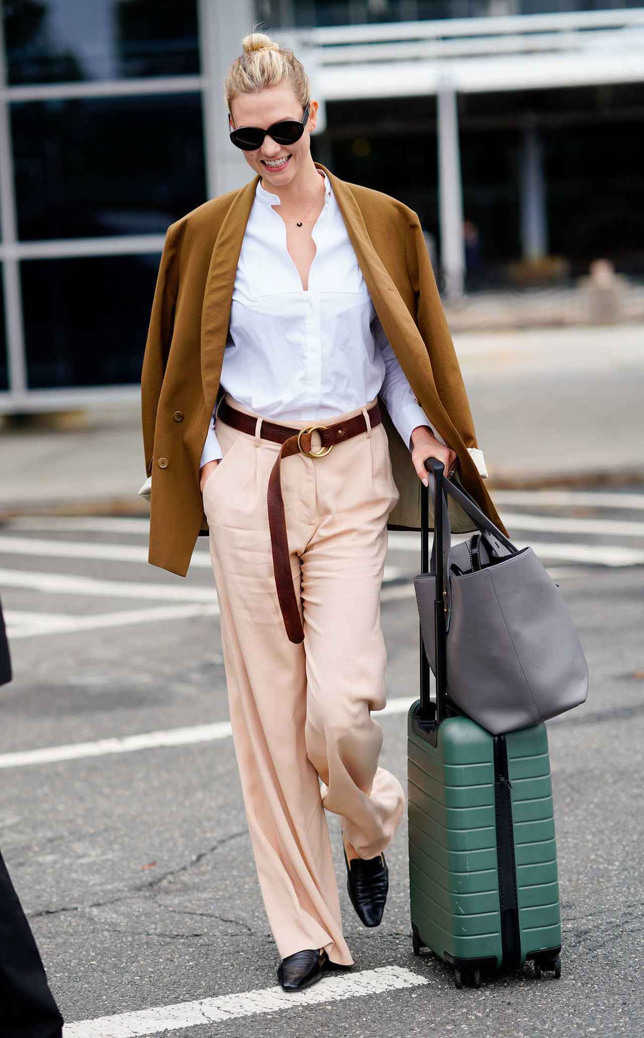 シンプルなカジュアルスタイルがお得意な、モデルのカーリー・クロスを空港でキャッチ! ライトブラウンのジャケットをメインに、白シャツとピンクベージュのパンツを合わせたブラウン系カラーコーディネートが秋らしくスタイリッシュ。