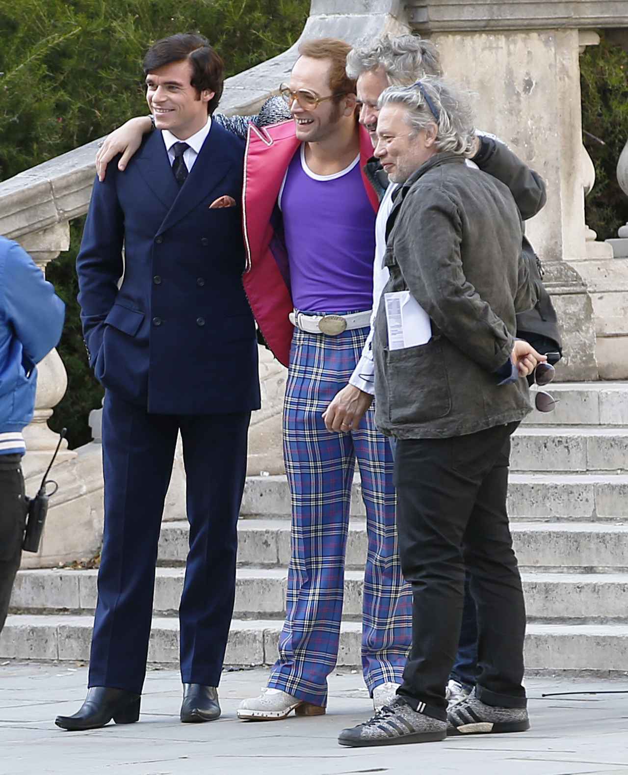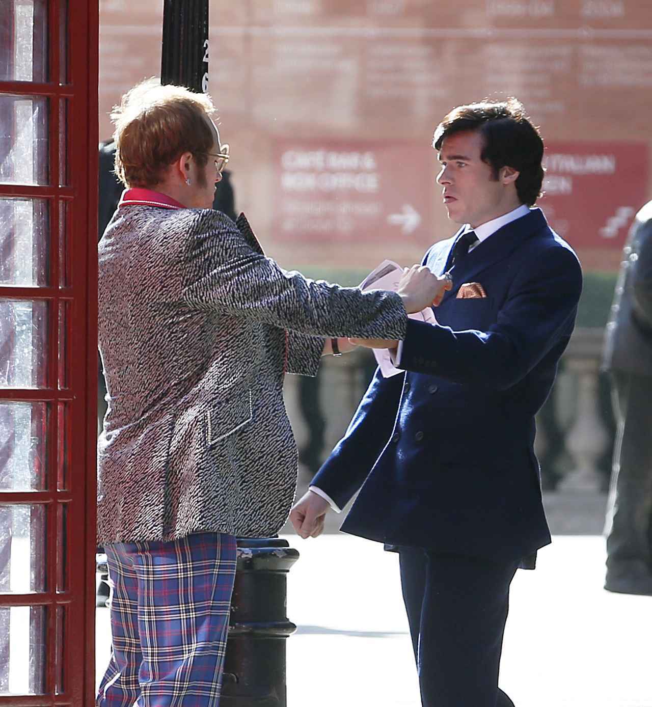 撮影中、エルトンに扮したタロンと何やら真剣な面持ちで話し合っていると思ったら…。