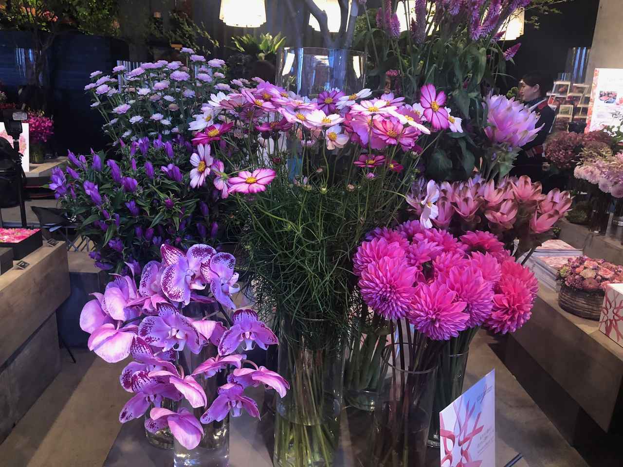 何種類ものピンクの花が使われたこのブーケは、ニコライの作品の中でもパワーを感じるサークル型。そして会場内に足を踏み入れると、ピンク色の花を中心に色とりどりの花が至る所に咲き誇っている。
