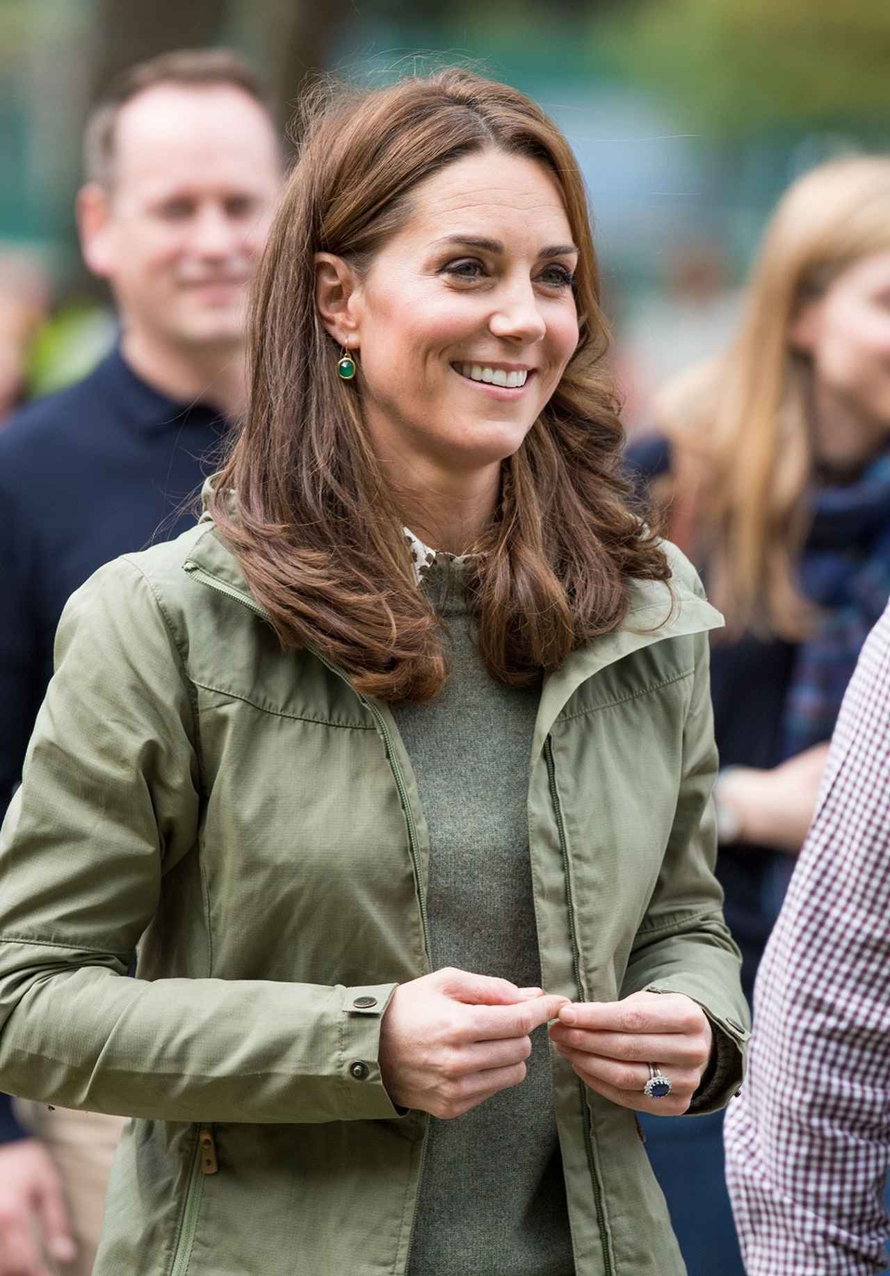 この日、日本では「カンケン(Kanken)」と呼ばれるリュックサックで知られる、スウェーデン発のアウトドアブランド、Fjall Raven(フェールラーベン)のカーキのワークジャケットに、同系色の薄手のニットを合わせ、さらに、深みのあるカーキのバイカージーンズを合わせたキャサリン妃。