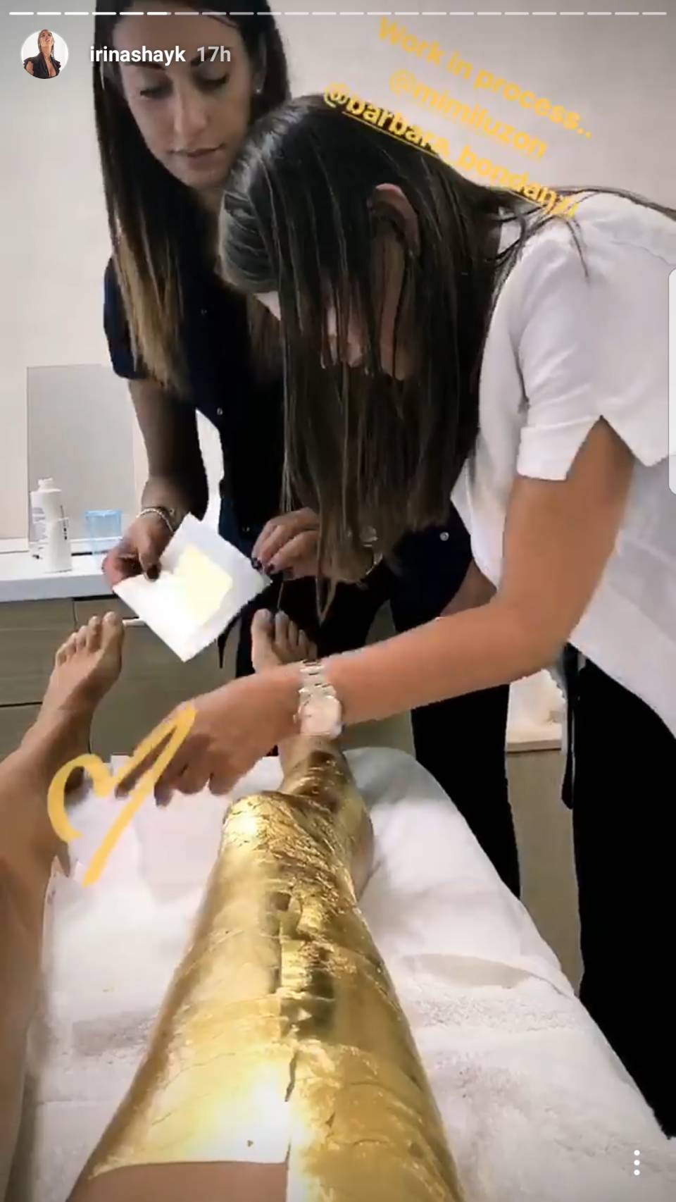 そんなまさにセレブなケアを受けているイリーナは、2人がかりで長い脚に何枚もの金箔を貼っていく様子を自身のインスタグラムに、「これまで脚を金にしたことがあった?」と嬉しそうにコメントをつけてアップ。